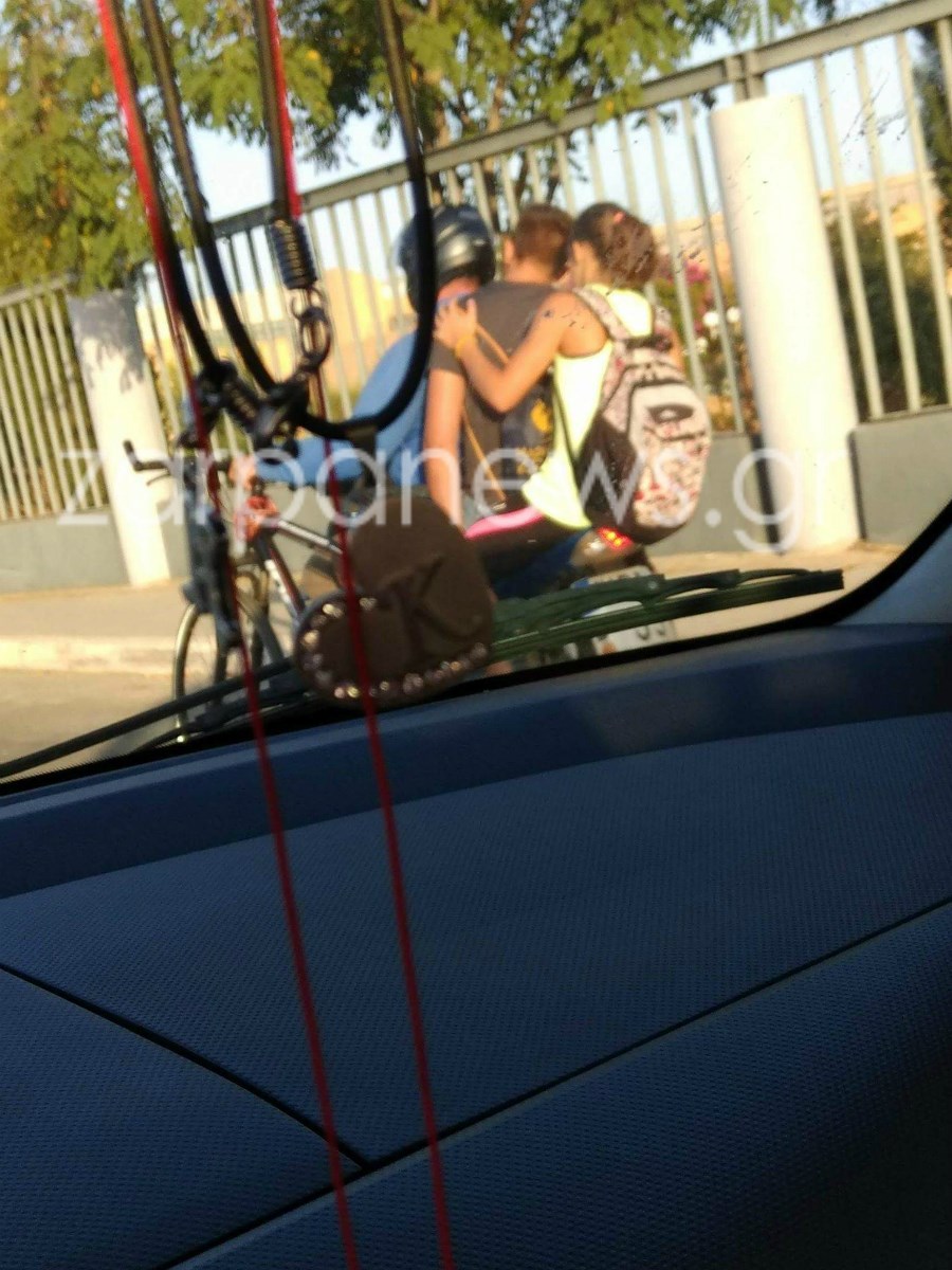 Στον ίδιο δρόμο-καρμανιόλα, τρία νεαρά παιδιά, δύο αγόρια και ένα κορίτσι, είναι τρικάβαλο σε ένα μηχανάκι και μαζί τους σέρνουν ένα ποδήλατο!
