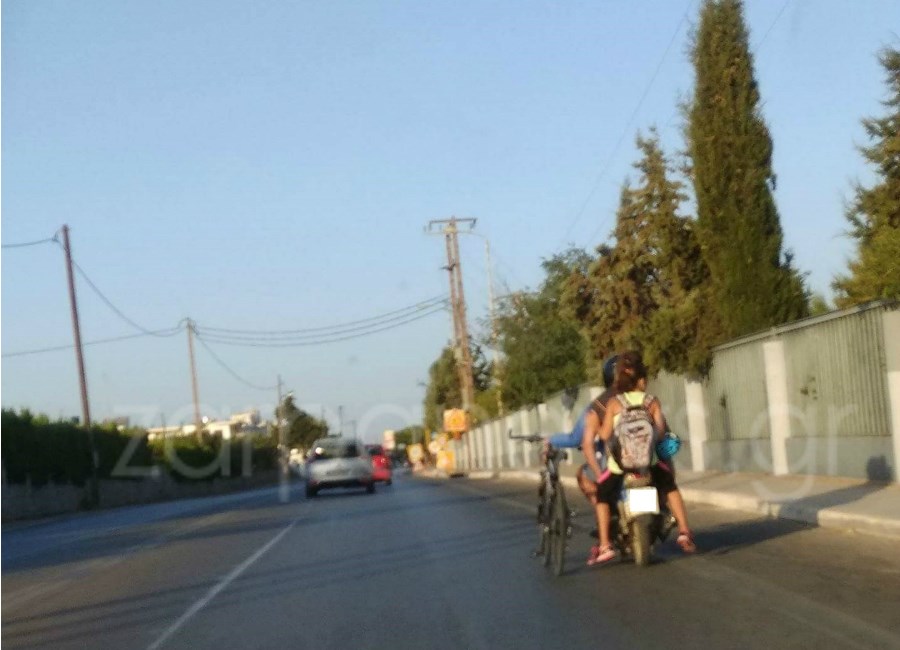 Στον ίδιο δρόμο-καρμανιόλα, τρία νεαρά παιδιά, δύο αγόρια και ένα κορίτσι, είναι τρικάβαλο σε ένα μηχανάκι και μαζί τους σέρνουν ένα ποδήλατο!