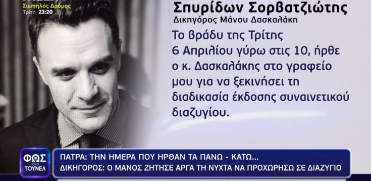 «Το βράδυ της Τρίτης 6 Απριλίου γύρω στις 22:00 ήρθε ο κ. Δασκαλάκης στο γραφείο μου για να ξεκινήσει τη διαδικασία έκδοσης συναινετικού διαζυγίου. Επειδή η ώρα ήταν προχωρημένη, ορίστηκε ένα δεύτερο ραντεβού δύο μέρες μετά, την Πέμπτη 8 Απριλίου για να συζητήσουμε τις λεπτομέρειες. Δεν προσήλθε γιατί είχε ήδη μεσολαβήσει η εισαγωγή του παιδιού στο νοσοκομείο. Με ενημέρωσε σχετικά ο ίδιος τηλεφωνικά», ανέφερε χαρακτηριστικά ο κύριος Σορβατζιώτης, με τη δημοσιογράφο να τον ρωτά: