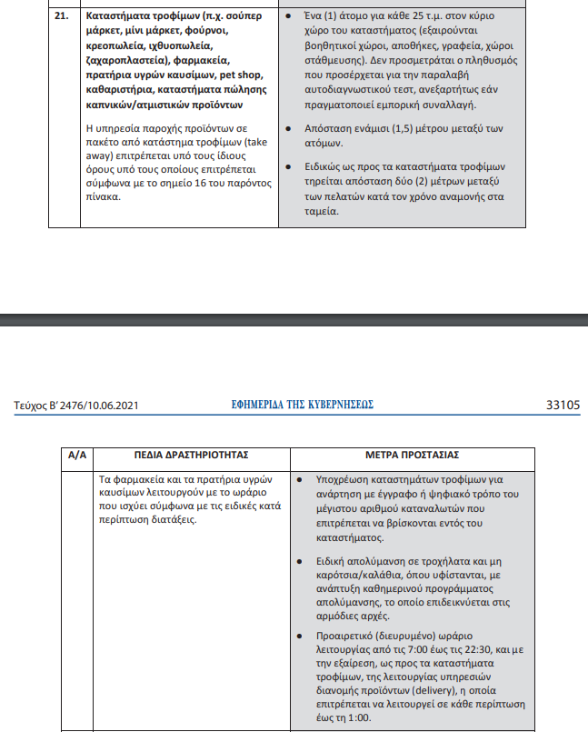-Για τα καταστήματα υγειονομικού ενδιαφέροντος που παρέχουν υπηρεσίες εστίασης εξακολουθούν να λειτουργούν αποκλειστικά σε ανοικτό υπαίθριο χώρο και από τις 12 Ιουνίου 2021 και σε εξωτερικούς χώρους που βρίσκονται σε αεριζόμενες στοές (υπό την προϋπόθεση αυτές να έχουν ανοικτές δύο πλευρές), και θα εξυπηρετούνται μόνο καθήμενοι πελάτες, με δυνατότητα λειτουργίας από τις 5:00 έως τις 01:15. και υπό τους γνωστούς υγειονομικούς όρους.