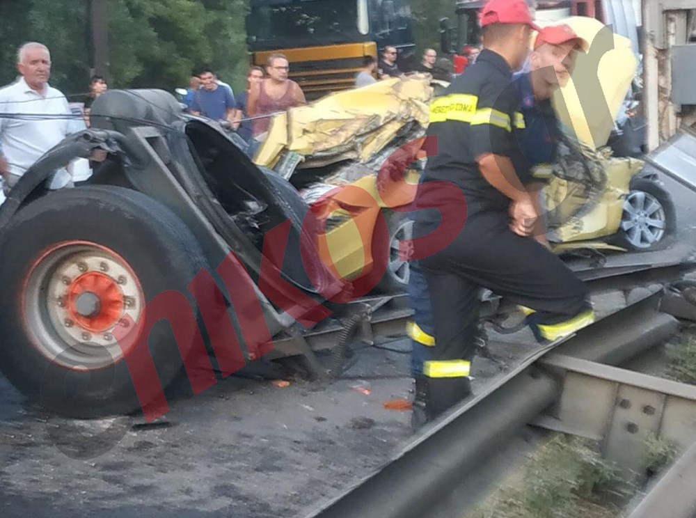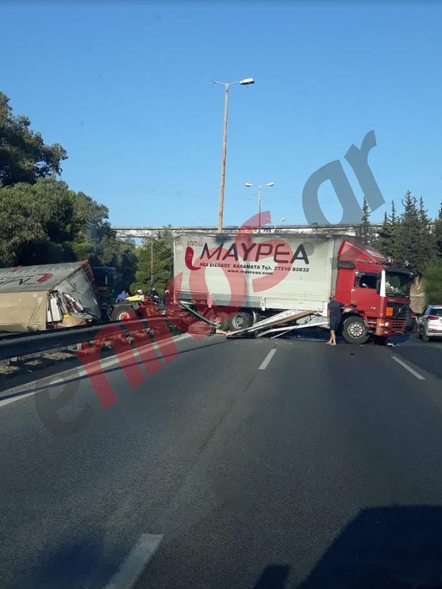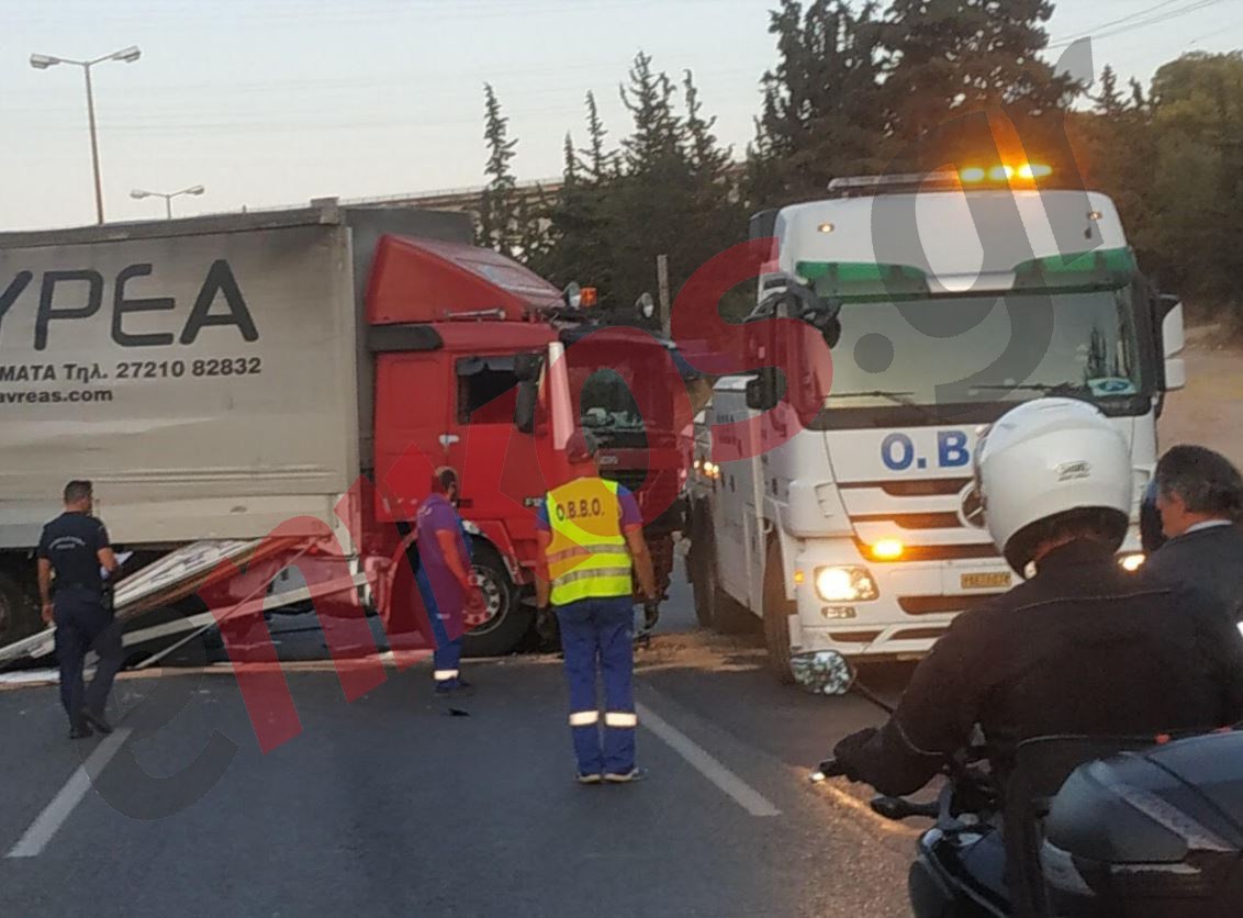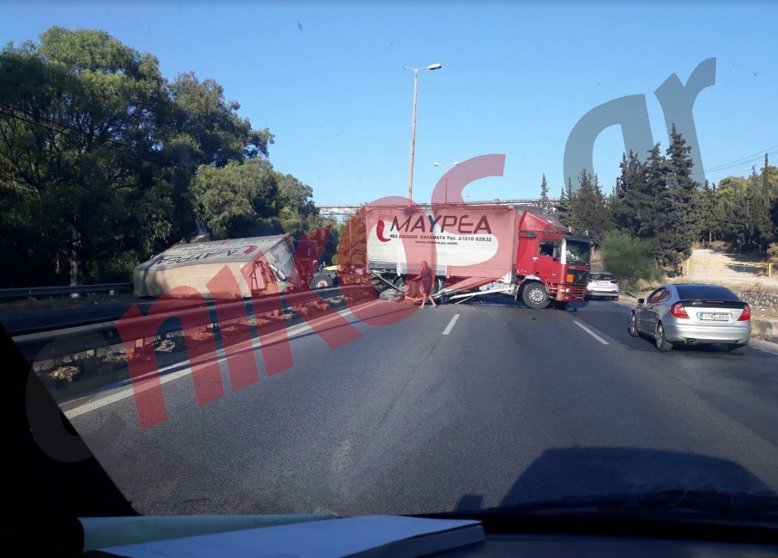 Συγκρούστηκαν η νταλίκα με το ταξί με αποτέλεσμα το ταξί να υποστεί υλικές ζημιές, ενώ το πίσω μέρος της νταλίκας να τουμπάρει. Το μπροστινό μέρος τρύπησε τις μπάρες και πέρασε στο αντίθετο ρεύμα κυκλοφορίας.