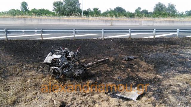 Η σύγκρουση ήταν τόσο σφοδρή ώστε ο κινητήρας εκτοξεύτηκε αρκετά μέτρα μακριά, όπως φαίνεται στις φωτογραφίες της ιστοσελίδας alexandriamou.gr.