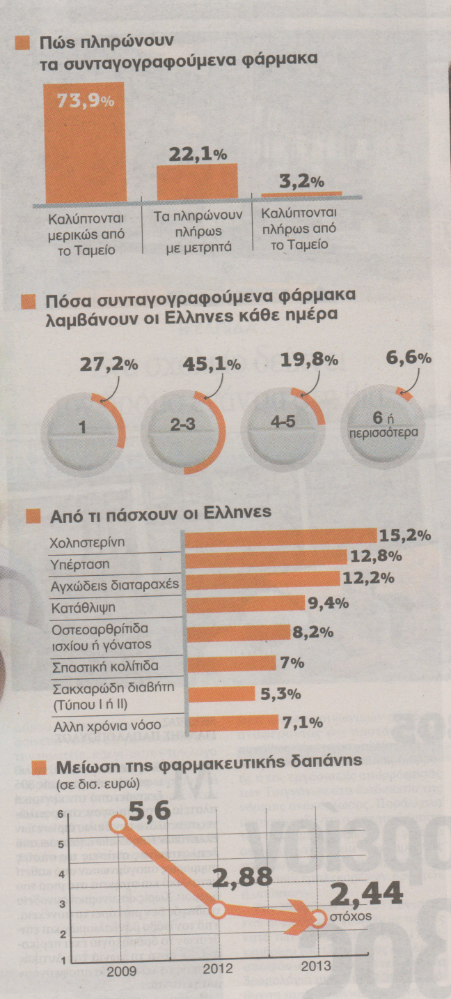 Ποσοστό 41,2% των ανθρώπων που πάσχουν από κάποιο χρόνιο νόσημα δήλωσε ότι πληρώνει για φάρμακα από 10 έως 50 ευρώ τον μήνα, το 22,9% από 50 έως και 100 ευρώ τον μήνα, ενώ το 8% ξοδεύει έως και 500 ευρώ μηνιαίως για τη φαρμακευτική αγωγή του.