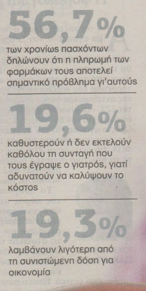 Δύο στους δέκα χρονίως πάσχοντες καθυστερούν ή δεν εκτελούν καθόλου τη συνταγή που τους έγραψε ο γιατρός τους ώστε να λάβουν τα απαραίτητα για την υγεία τους φάρμακα, αφού αδυνατούν να καλύψουν το κόστος.