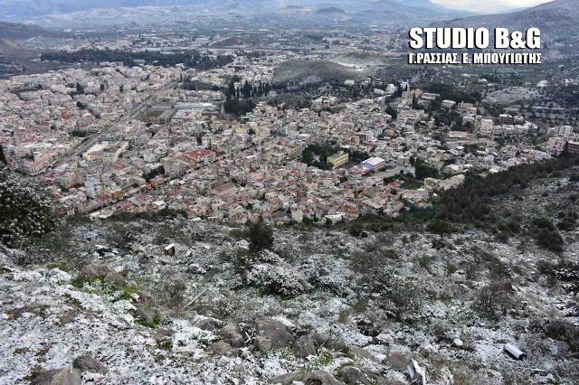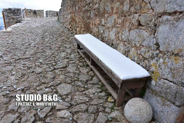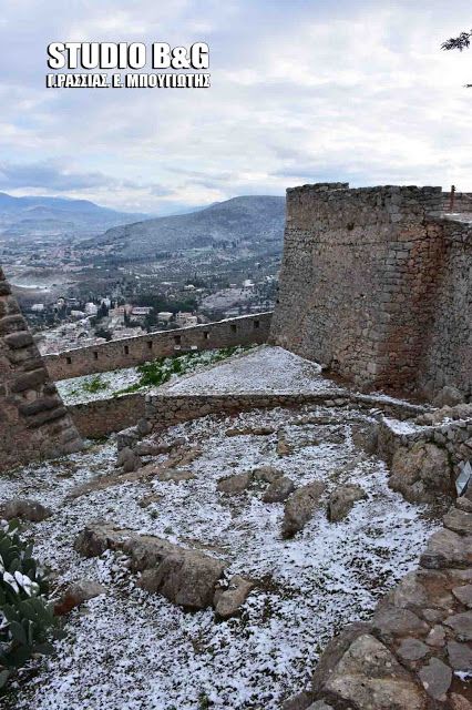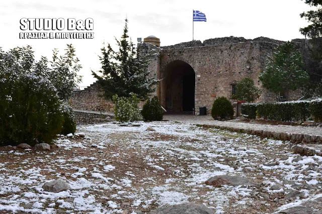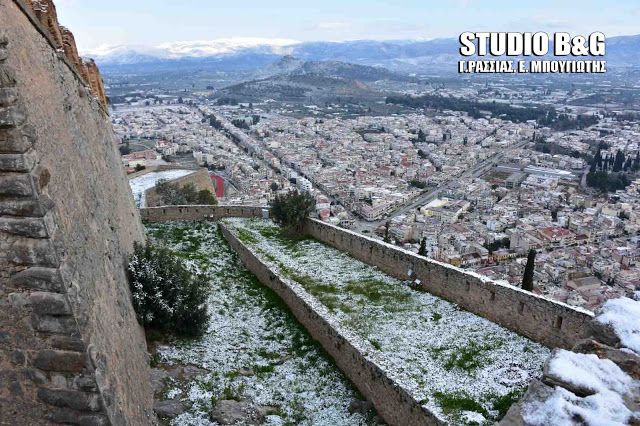 Η βορειοανατολική πλευρά του κάστρου έχει δεχθεί το περισσότερο χιόνι, ενώ και ο δρόμος που οδηγεί στο μεσαιωνικό κάστρο του Ναυπλίου είναι ντυμένος στα λευκά.
