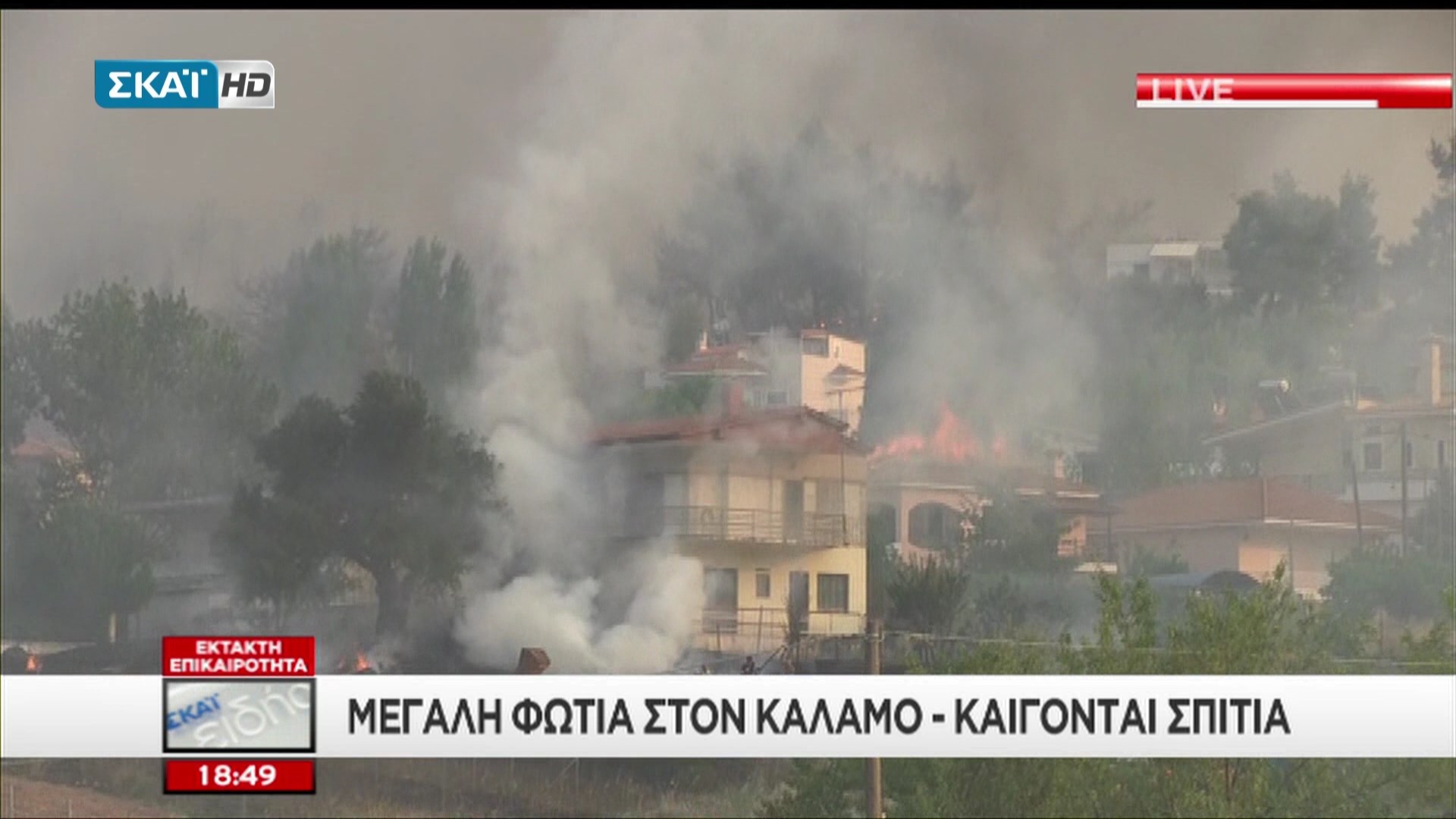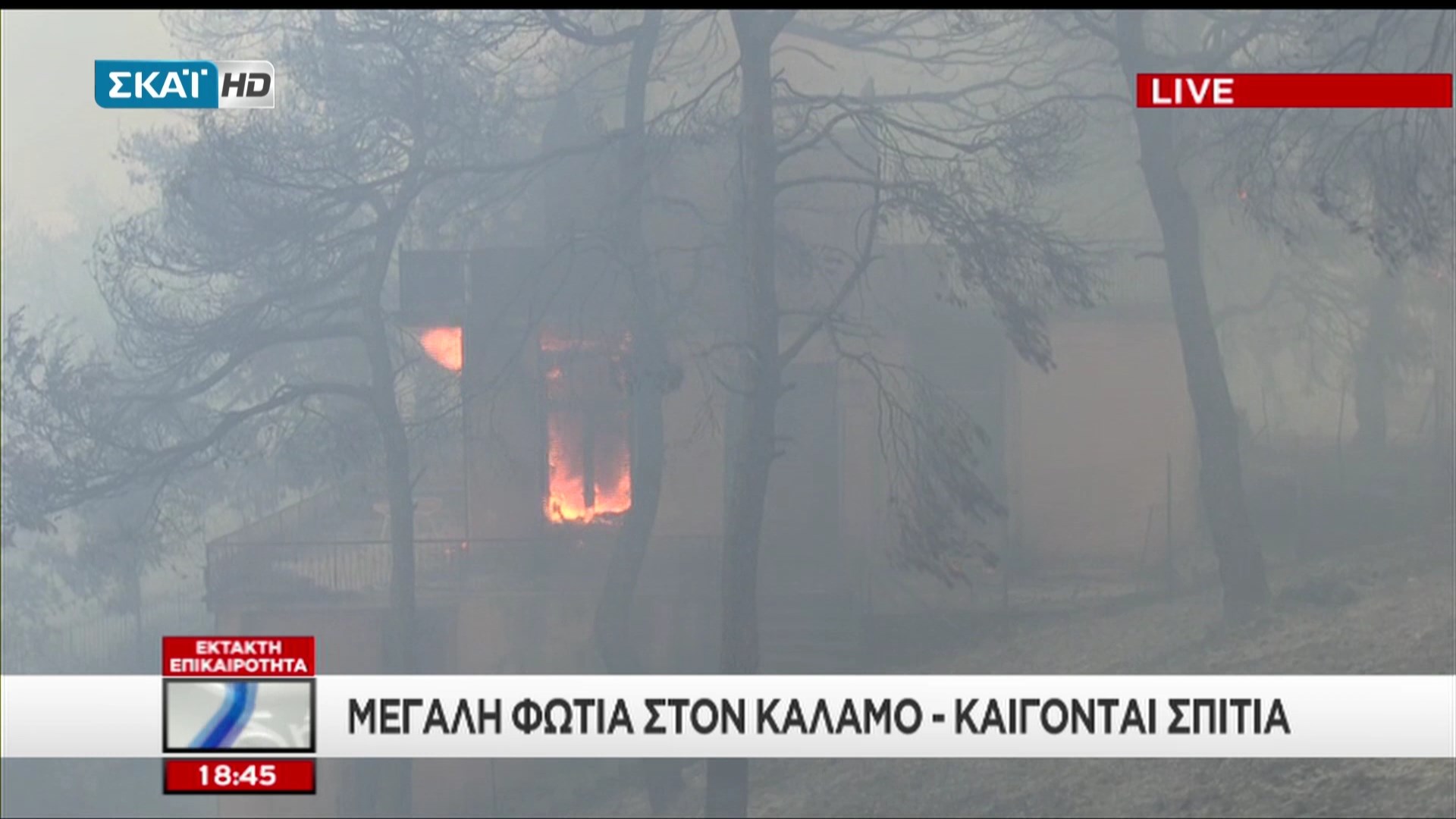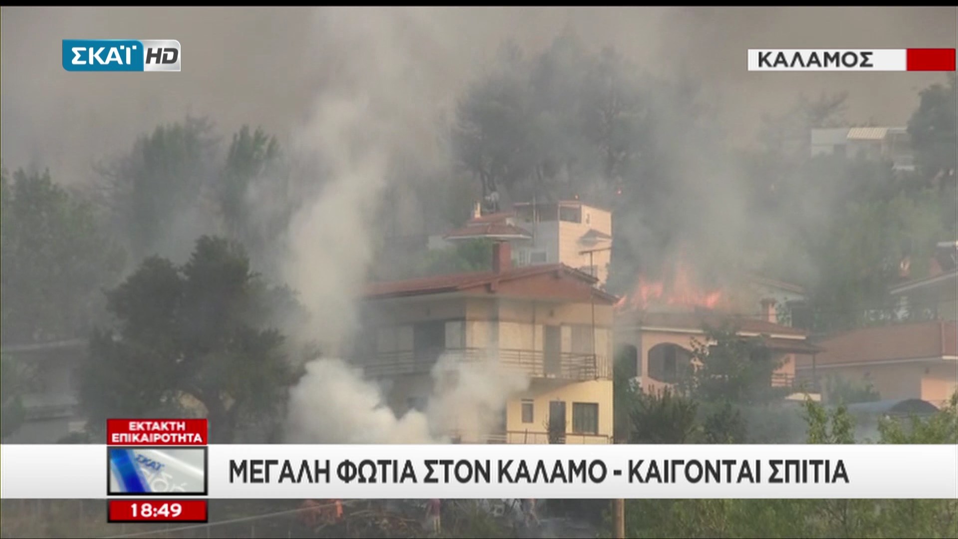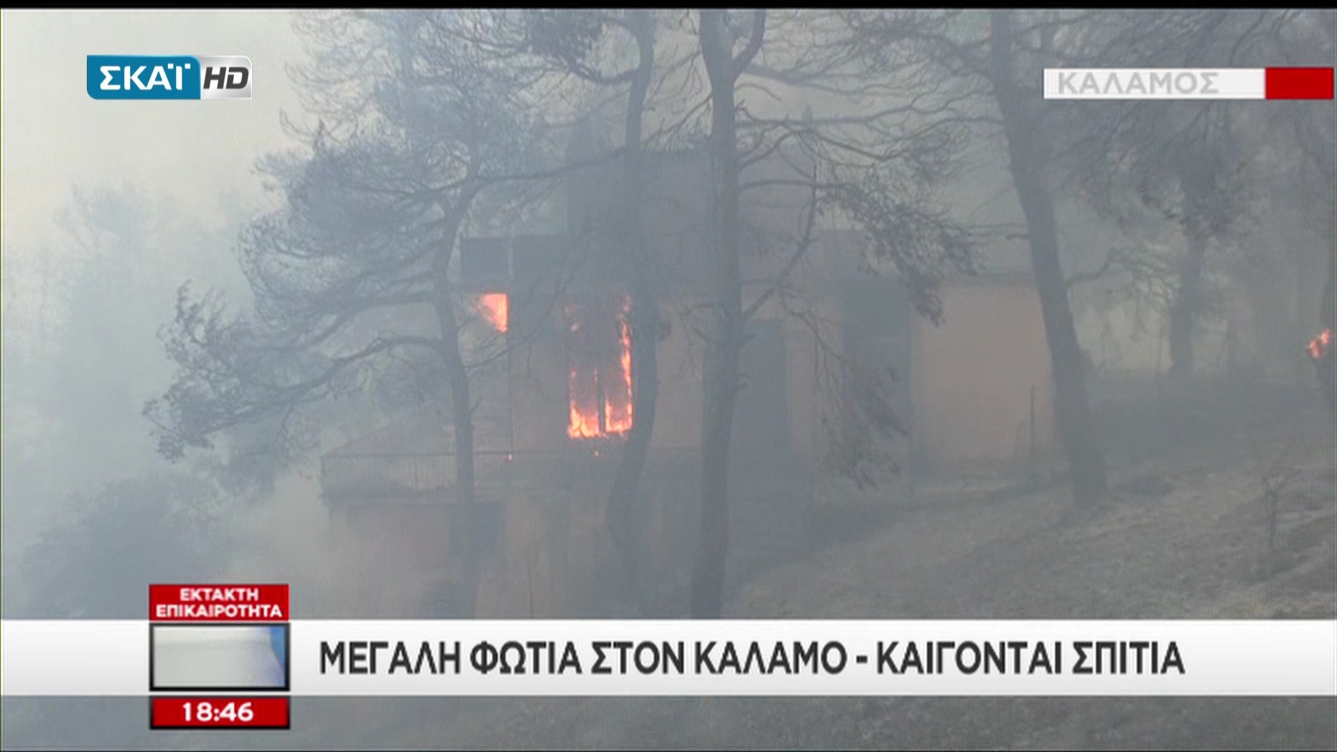 Ένα σπίτι στον οικισμό του Καλάμου έχει τυλιχθεί στις φλόγες από τη μεγάλη φωτιά που είναι σε εξέλιξη στην περιοχή από τις 4 το μεσημέρι.Κοντά στο σημείο, σε ένα άλλο σπίτι κάηκε η σκεπή και οι κάτοικοι κάνουν έκκληση να ενισχυθούν οι πυροσβεστικές δυνάμεις. Σύμφωνα με αυτόπτες μάρτυρες έχουν καεί 5 σπίτια.Δείτε καρέ από τον ΣΚΑΪ: