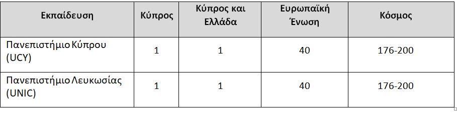 Η πιο δημοφιλής κατάταξη από τις πιο πάνω είναι η Times Higher Education World University Rankings. Η κατάταξη ελληνικών και κυπριακών πανεπιστημίων μαζί στην κατάταξη αυτή: