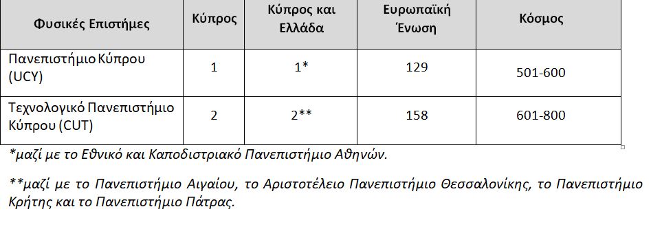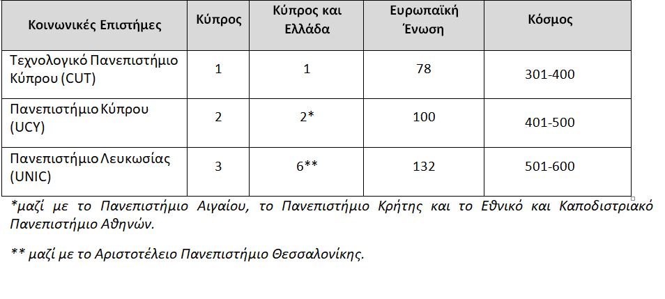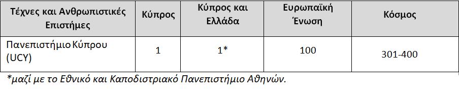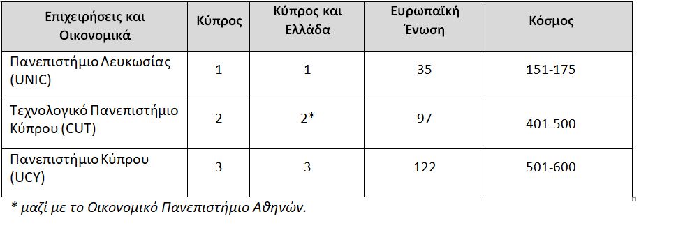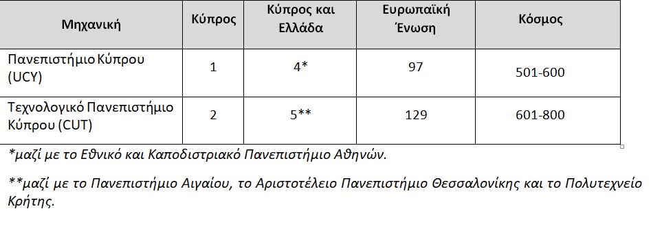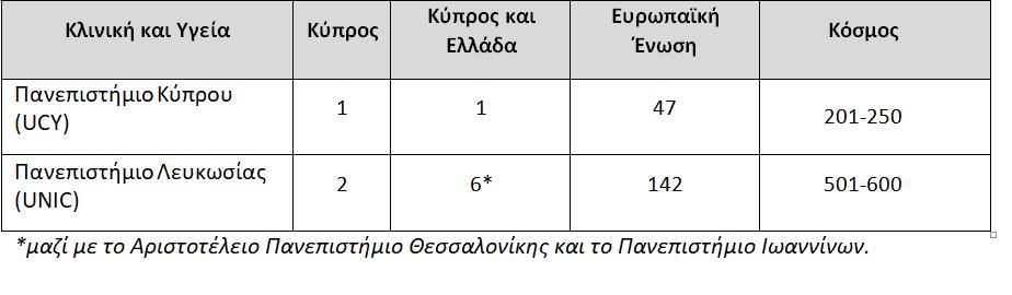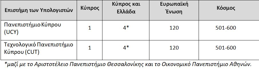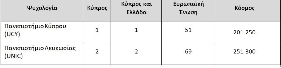 Η κατάταξη των κυπριακών πανεπιστημίων στη λίστα Τimes Higher Education, World University Rankings By Subject για το 2023, σε πέντε ενδεικτικά αντικείμενα: