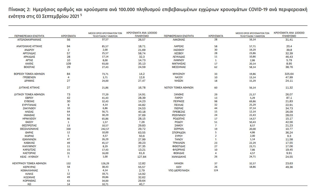 Τα νέα εργαστηριακά επιβεβαιωμένα κρούσματα της νόσου που καταγράφηκαν τις τελευταίες 24 ώρες είναι 2.729 , εκ των οποίων 13 εντοπίστηκαν κατόπιν ελέγχων στις πύλες εισόδου της χώρας. Ο συνολικός αριθμός των κρουσμάτων ανέρχεται σε 596.383 (ημερήσια μεταβολή +0.5%), εκ των οποίων 51.1% άνδρες. Με βάση τα επιβεβαιωμένα κρούσματα των τελευταίων 7 ημερών, 164 θεωρούνται σχετιζόμενα με ταξίδι από το εξωτερικό και 1.478 είναι σχετιζόμενα με ήδη γνωστό κρούσμα.