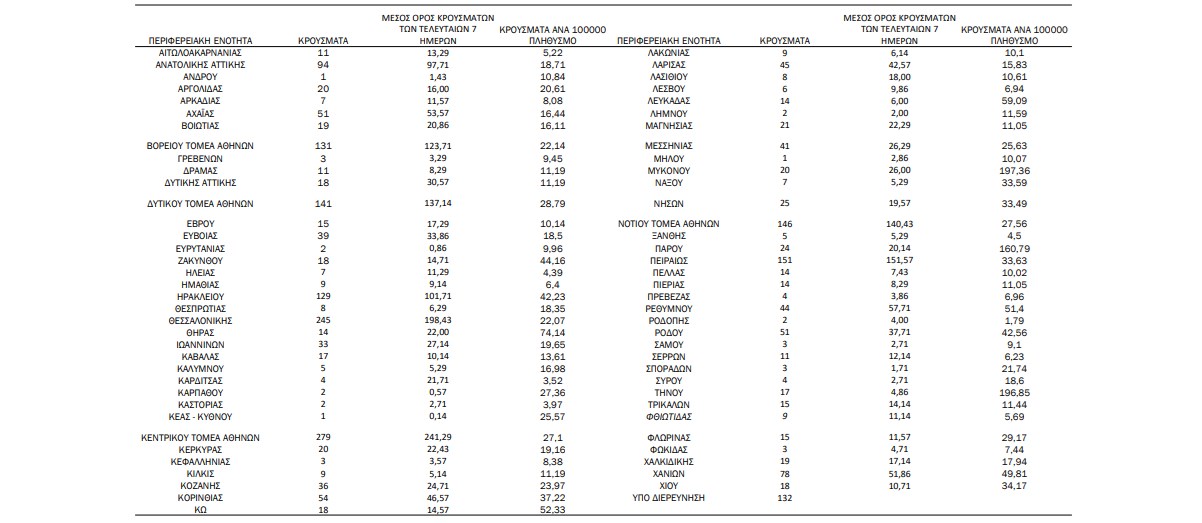 Τα νέα εργαστηριακά επιβεβαιωμένα κρούσματα της νόσου που καταγράφηκαν τις τελευταίες 24 ώρες είναι 2.472 , εκ των οποίων 13 εντοπίστηκαν κατόπιν ελέγχων στις πύλες εισόδου της χώρας. Ο συνολικός αριθμός των κρουσμάτων ανέρχεται σε 474.366 (ημερήσια μεταβολή +0.5%), εκ των οποίων 51.2% άνδρες. Με βάση τα επιβεβαιωμένα κρούσματα των τελευταίων 7 ημερών, 131 θεωρούνται σχετιζόμενα με ταξίδι από το εξωτερικό και 1.402 είναι σχετιζόμενα με ήδη γνωστό κρούσμα.