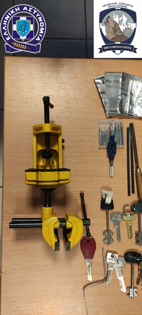 Σε έρευνες που πραγματοποιήθηκαν στα σπίτια των τριών συλληφθέντων βρέθηκαν, μεταξύ άλλων, και κατασχέθηκαν διαρρηκτικά εργαλεία, μεταλλική μέγγενη πάγκου, ηλεκτρικό εργαλείο λιμαρίσματος αντικειμένων, κουκούλα προσώπου, μύλος κλειδαριάς θύρας οικίας, κλειδιά από κλειδαριές τύπου χρηματοκιβωτίου, συσκευή εντοπισμού GPS, δώδεκα κινητά τηλέφωνα, έξι ρολόγια και δύο tablet η νόμιμη κατοχή των οποίων ερευνάται, τέσσερα φιαλίδια με υγρή μεθαδόνη συνολικού μικτού βάρους 591,8 γραμμαρίων, ένα μικροδέμα ηρωίνης, δύο σπρέι πιπεριού και ένα αναδιπλούμενο μαχαίρι – τύπου στιλέτο.