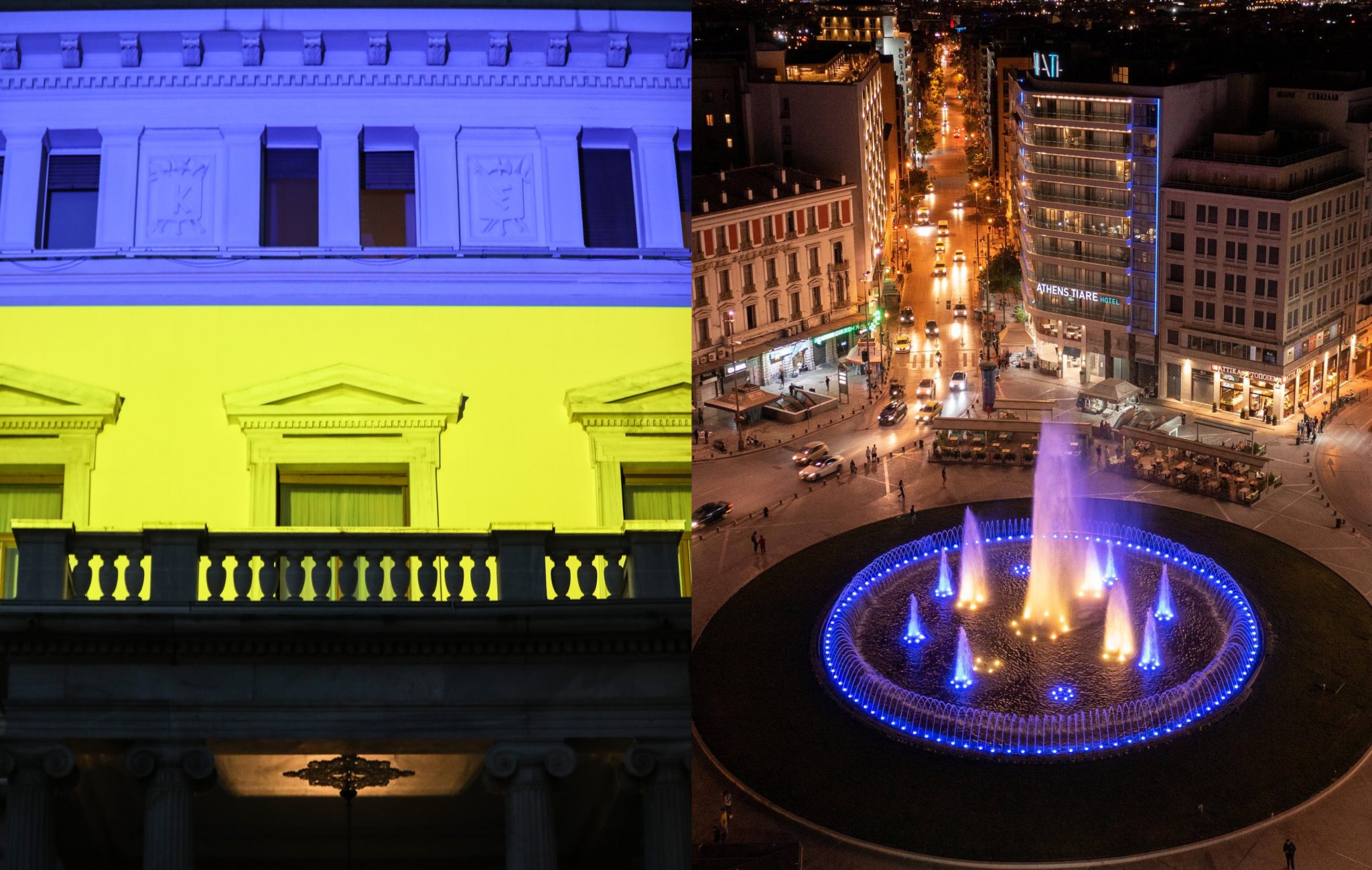 Στα χρώματα της σημαίας της Ουκρανίας, σε μπλε και κίτρινο, φωταγωγήθηκαν το βράδυ της Δευτέρας το σιντριβάνι της Ομόνοιας και το Προεδρικό Μέγαρο.