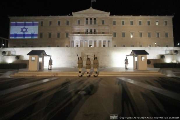 Με τα χρώματα της σημαίας του Ισραήλ φωταγωγήθηκε η πρόσοψη του κτηρίου της Βουλής των Ελλήνων σε ένδειξη συμπαράσταση για τις απάνθρωπες τρομοκρατικές επιθέσεις που υπέστη από τη Χαμάς ο ισραηλινός λαός