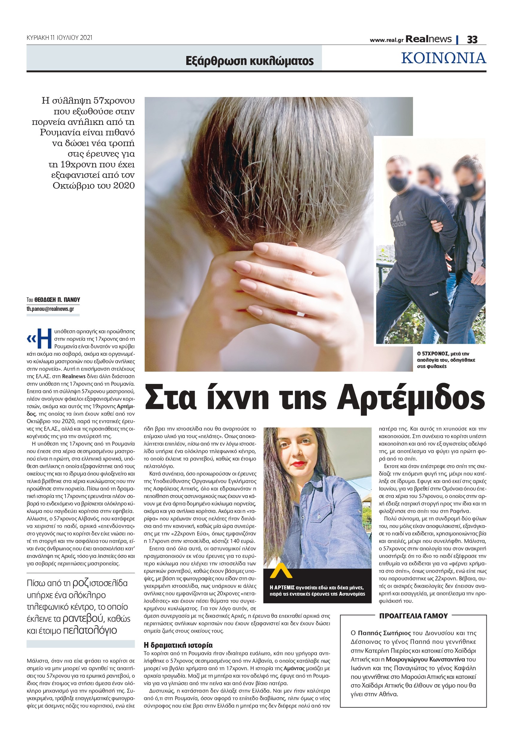 «Η υπόθεση αρπαγής και προώθησης στην πορνεία της 17χρονης από τη Ρουμανία είναι δυνατόν να κρύβει κάτι ακόμα πιο σοβαρό, ακόμα και οργανωμένο κύκλωμα μαστροπών που εξωθούν ανήλικες στην πορνεία». Αυτή η επισήμανση στελέχους της ΕΛ.ΑΣ. στη Realnews δίνει άλλη διάσταση στην υπόθεση της 17χρονης από τη Ρουμανία. Επειτα από τη σύλληψη 57χρονου μαστροπού, πλέον ανοίγουν φάκελοι εξαφανισμένων κοριτσιών, ακόμα και αυτός της 19χρονης Αρτέμιδος, της οποίας τα ίχνη έχουν χαθεί από τον Οκτώβριο του 2020, παρά τις εντατικές έρευνες της ΕΛ.ΑΣ., αλλά και τις προσπάθειες της οικογένειάς της για την ανεύρεσή της. Η υπόθεση της 17χρονης από τη Ρουμανία που έπεσε στα χέρια σεσημασμένου μαστροπού είναι η πρώτη, στα ελληνικά χρονικά, υπόθεση ανήλικης η οποία εξαφανίστηκε από τους οικείους της και το ίδρυμα όπου φιλοξενείτο και τελικά βρέθηκε στα χέρια κυκλώματος που την προώθησε στην πορνεία. Πίσω από τη δραματική ιστορία της 17χρονης ερευνάται πλέον σοβαρά το ενδεχόμενο να βρίσκεται ολόκληρο κύκλωμα που παγιδεύει κορίτσια στην εφηβεία. Αλλωστε, ο 57χρονος Αλβανός, που κατάφερε να χειριστεί το παιδί, αρχικά «επενδύοντας» στο γεγονός πως το κορίτσι δεν είχε νιώσει ποτέ τη στοργή και την ασφάλεια του πατέρα, είναι ένας άνθρωπος που έχει απασχολήσει κατ’ επανάληψη τις Αρχές, τόσο για ληστείες όσο και για σοβαρές περιπτώσεις μαστροπείας. Μάλιστα, όταν πια είχε φτάσει το κορίτσι σε σημείο να μην μπορεί να αρνηθεί τις απαιτήσεις του 57χρονου για τα ερωτικά ραντεβού, ο ίδιος ήταν έτοιμος να στήσει άμεσα έναν ολόκληρο μηχανισμό για την προώθησή της. Συγκεκριμένα, τράβηξε επαγγελματικές φωτογραφίες με άσεμνες πόζες του κοριτσιού, ενώ είχε ήδη βρει την ιστοσελίδα που θα αναρτούσε το επίμαχο υλικό για τους «πελάτες».