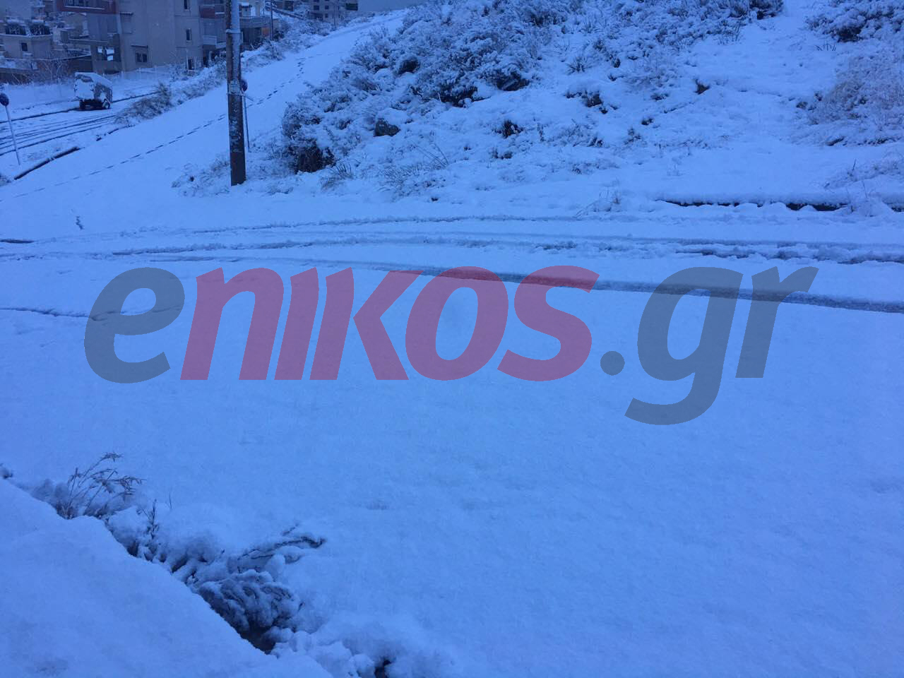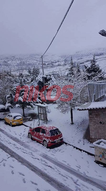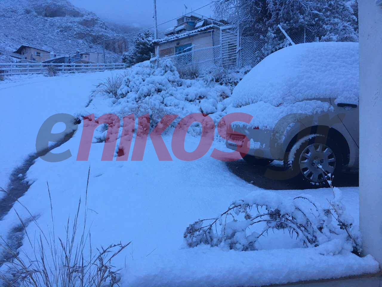 Στις φωτογραφίες που έστειλε αναγνώστης του enikos.gr βλέπουμε το χιόνι να έχει σκεπάσει τα αυτοκίνητα και τις σκεπές των σπιτιών.