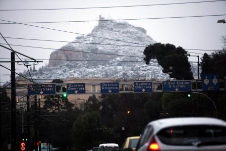 Ακρόπολη, Λυκαβηττός, και κεντρικές εμπορικές οδοί της Αθήνας είναι στρωμένοι με χιόνι.