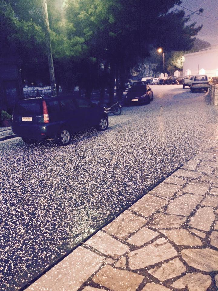 Χιονισμένο έμοιαζε το τοπίο στη Νάξο από τη σφοδρή χαλαζόπτωση που έπληξε λίγο πριν από τις 8 το βράδυ το νησί.