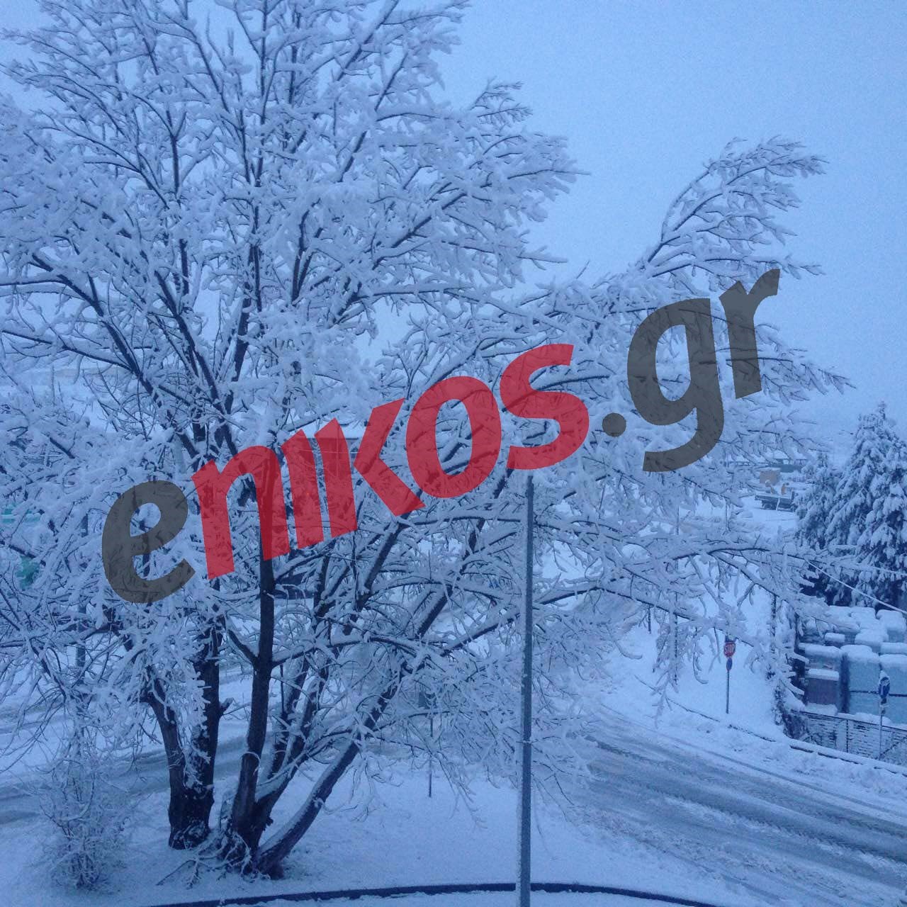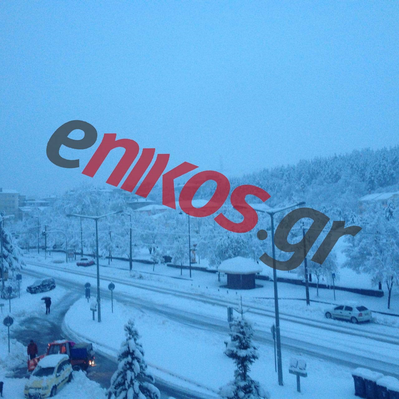 Όπως φαίνεται στις φωτογραφίες που έστειλε αναγνώστης του enikos.gr, πυκνό χιόνι έχει καλύψει την περιοχή.