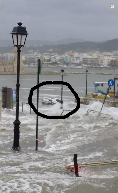 Η θάλασσα που βγήκε κυριολεκτικά στη στεριά και πλημμύρισε το σημείο έξω από το Λιμεναρχείο. Ήδη έχει παρασυρθεί από τα νερά ένα σταθμευμένο αυτοκίνητο που κατάληξε στον πυθμένα του ενετικού λιμανιού.