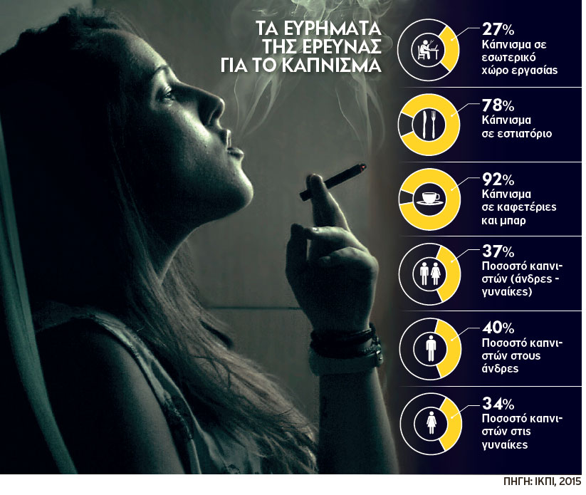 Ένας στους τέσσερις Έλληνες δηλώνουν ότι το κάπνισμα επιτρέπεται στον εργασιακό τους χώρο, τέσσερις στους πέντε ότι βλέπουν ανθρώπους να καπνίζουν στα εστιατόρια που επισκέπτονται και εννέα στους δέκα στις καφετέριες και στα μπαρ.