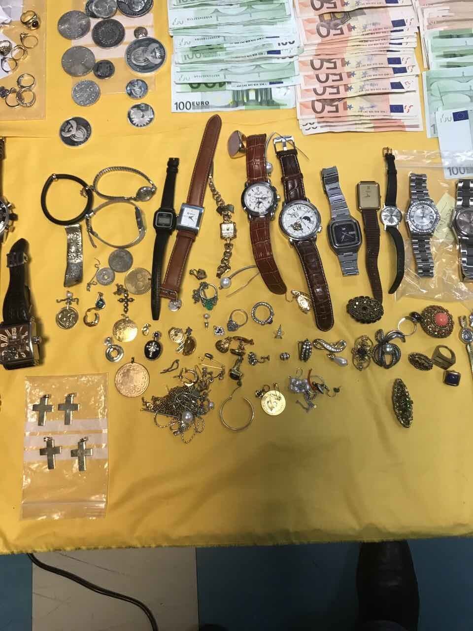 Στη συνέχεια συνελήφθη η 40χρονη, ενώ σε αστυνομικές έρευνες σε σπίτια και καταστήματα, βρέθηκαν και κατασχέθηκαν, μεταξύ άλλων: Δύο πλάκες χρυσού, βάρους περίπου 1 κιλού και αξίας 25.000 ευρώ, ασημένια εικόνα (αγαλματίδιο) της Παναγίας βάρος περίπου τριών κιλών, αξίας 3.000 ευρώ, πλάκα ασημιού βάρους περίπου 300 γραμμαρίων, πλήθος κοσμημάτων και ρολογιών, τέσσερα ειδικά φουρνάκια, στα οποία έλιωναν τα χρυσά κοσμήματα, πλήρης μονάδα φασματογράφου, με την οποία μετρούσαν την καθαρότητα λιωμένου χρυσού και δύο καλούπια μορφοποίησης λιωμένου χρυσού.