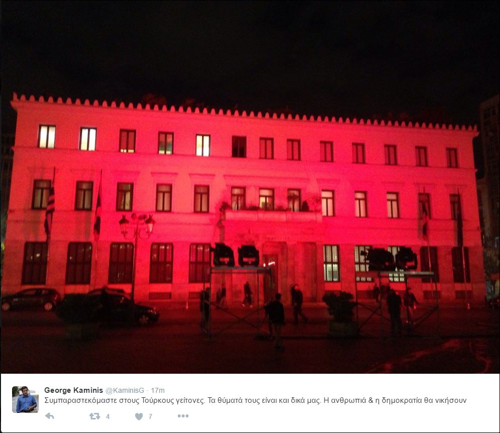 «Συμπαραστεκόμαστε στους Τούρκους γείτονες. Τα θύματά τους είναι και δικά μας. Η ανθρωπιά και η δημοκρατία θα νικήσουν», έγραψε στη λεζάντα της φωτογραφίας που ανήρτησε στο Twitter ο Δήμαρχος Αθηναίων Γιώργος Καμίνης.