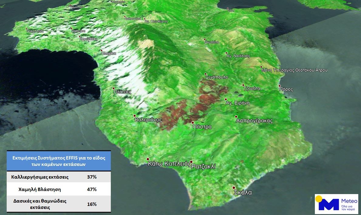 “Στάχτη” έγιναν περίπου 6.000 στρέμματα στην Κεφαλονιά κατά τις καταστροφικές πυρκαγιές της 2ας, 3ης και 4ης Ιουλίου, σύμφωνα με τις πρώτες εκτιμήσεις με βάση τις εικόνες του ευρωπαϊκού περιβαλλοντικού δορυφόρου Sentinel-2. Οι καμένες περιοχές υπολογίστηκαν από το Εθνικό Αστεροσκοπείο Αθηνών/meteo.gr.