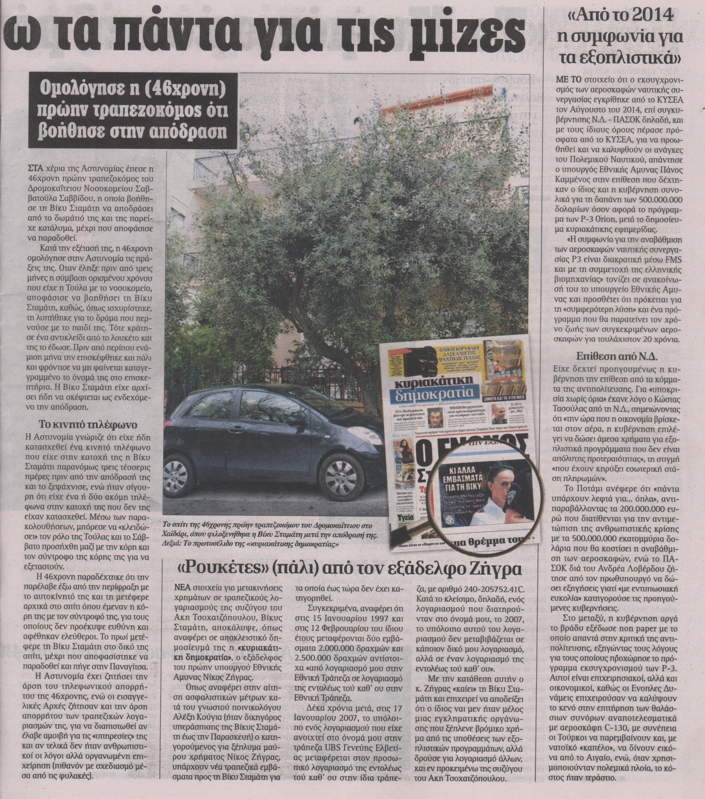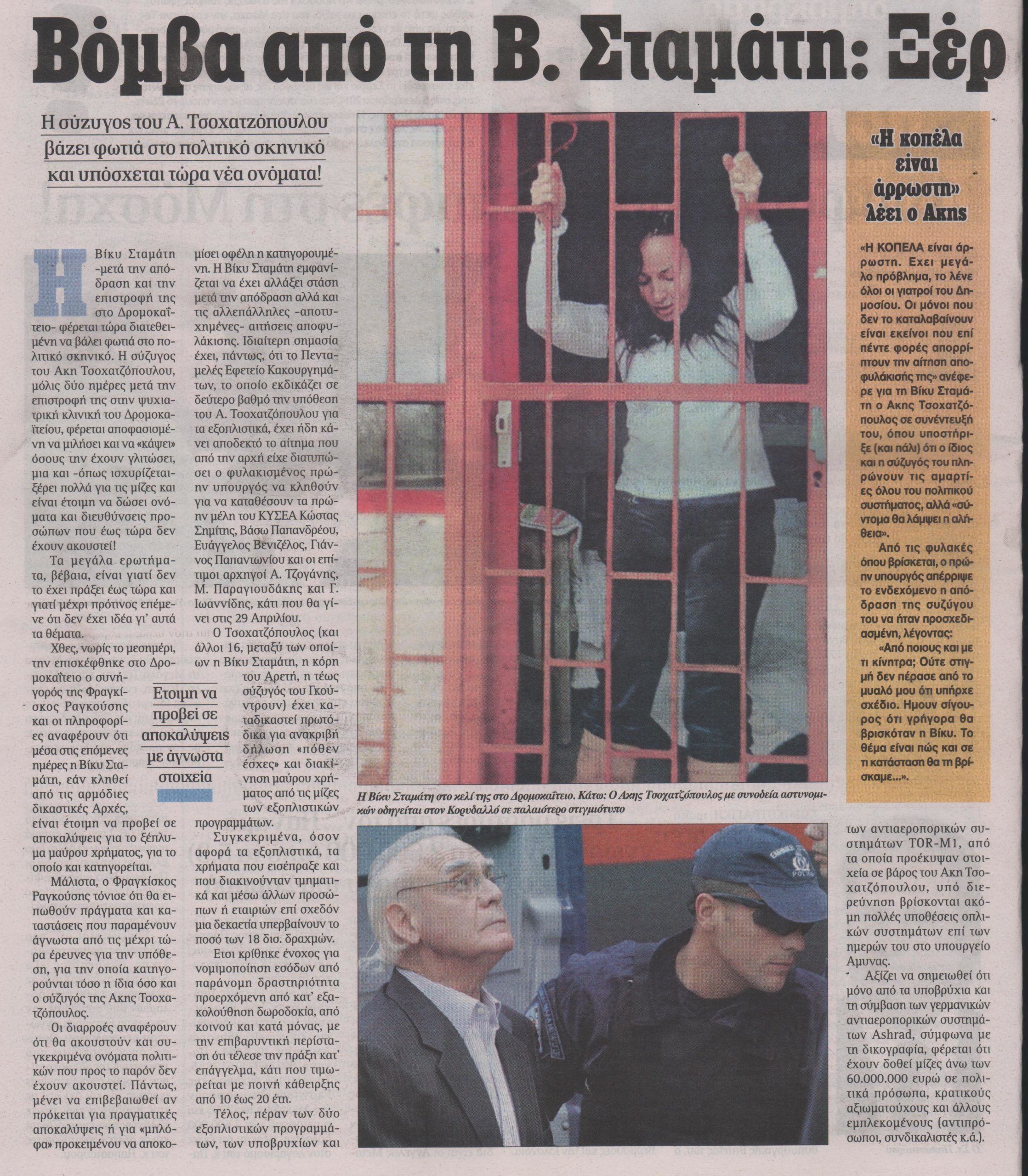 Χθες, νωρίς το μεσημέρι, την επισκέφθηκε στο Δρομοκαΐτειο ο συνήγορός της Φραγκίσκος Ραγκούσης και οι πληροφορίες αναφέρουν ότι μέσα στις επόμενες ημέρες η Βίκυ Σταμάτη, εάν κληθεί από τις αρμόδιες δικαστικές Αρχές, είναι έτοιμη να προβεί σε αποκαλύψεις για το ξέπλυμα μαύρου χρήματος, για το οποίο και κατηγορείται.