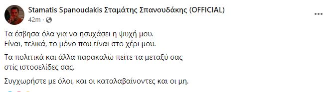 «Τα έσβησα όλα για να ησυχάσει η ψυχή μου» αναφέρει χαρακτηριστικά ο Σταμάτης Σπανουδάκης στο Facebook. «Είναι, τελικά, το μόνο που είναι στο χέρι μου. Τα πολιτικά και άλλα παρακαλώ πείτε τα μεταξύ σας στις ιστοσελίδες σας. Συγχωρήστε με όλοι, και οι καταλαβαίνοντες και οι μη» προσθέτει ο σπουδαίος συνθέτης.