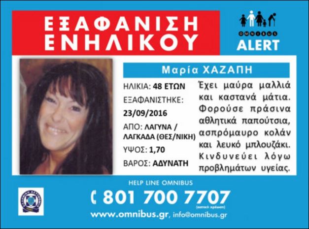 Η εξαφάνιση της 48χρονης, από τα Λαγυνά Θεσσαλονίκης, είχε δηλωθεί στις 23 Σεπτεμβρίου. Μάλιστα, για την περίπτωσή της ενεργοποιήθηκε η υπηρεσία κοινωνικού συναγερμού (omnibus alert), σύμφωνα με την οποία η γυναίκα βρισκόταν σε κίνδυνο εξαιτίας προβλημάτων υγείας.