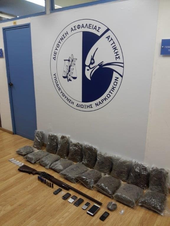 Από τις έρευνες σε οικίες στις Αχαρνές και στα Άνω Λιόσια, βρέθηκαν και κατασχέθηκαν: ποσότητα ακατέργαστης κάνναβης βάρους 16 κιλών και -911- γραμμαρίων, 43 ναρκωτικά δισκία, μικροποσότητα ηρωίνης, μία κυνηγετική καραμπίνα, εννέα κυνηγετικά φυσίγγια και επτά κινητά τηλέφωνα