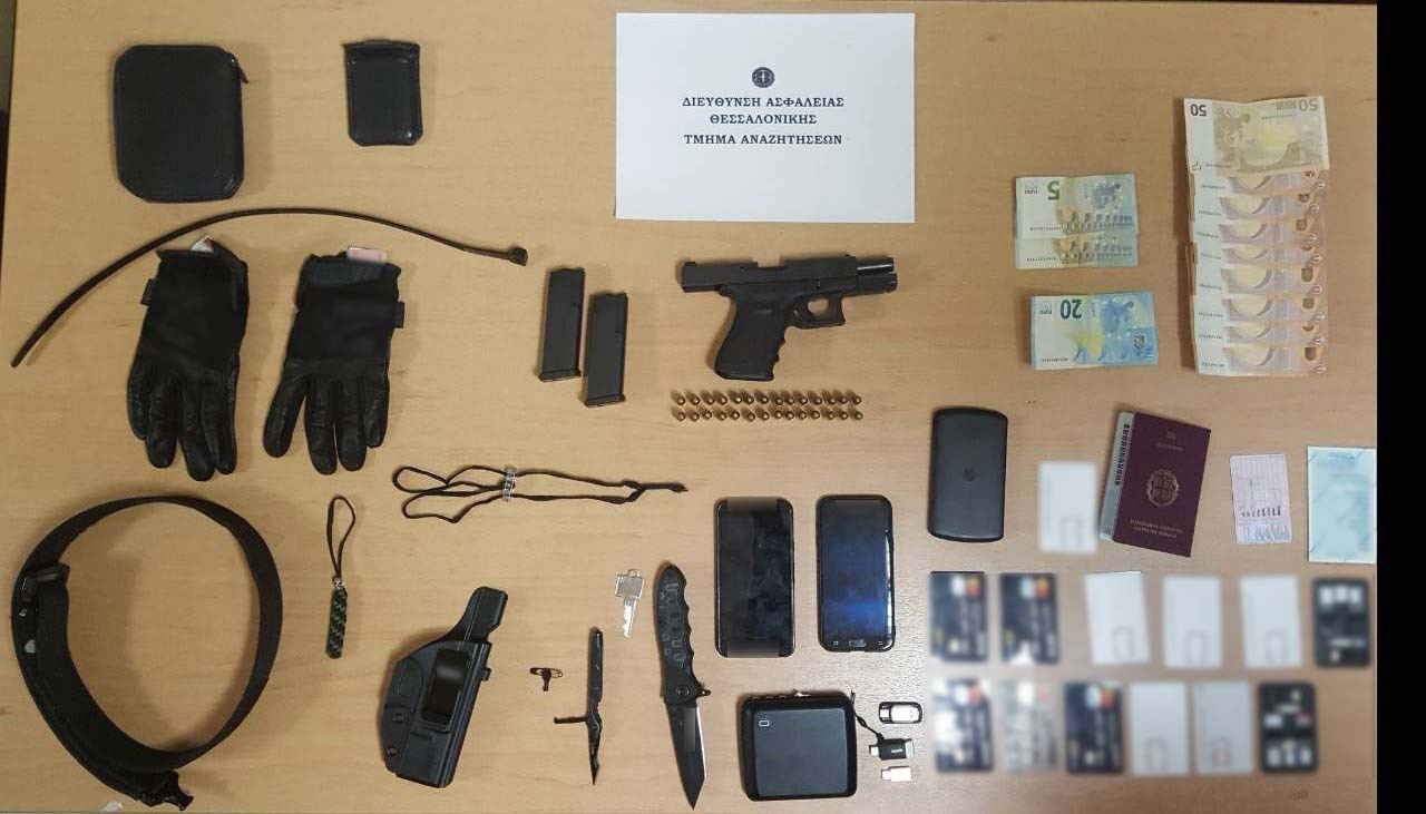 Αστυνομικοί που τον συνέλαβαν βρήκαν στην κατοχή του ένα πιστόλι, δύο γεμιστήρες με φυσίγγια, ένα σουγιά, ένα αναδιπλούμενο μαχαίρι σε μορφή στυλογράφου το οποίο έφερε ειδικό κλειδί χειροπέδων, μία συσκευή διασύνδεσης – απόκρυψης ηλεκτρονικού ίχνους στο Διαδίκτυο, κινητά τηλέφωνα και κάρτες σύνδεσης κινητής τηλεφωνίας. Επίσης, κατασχέθηκαν πιστωτικές και χρεωστικές κάρτες με στοιχεία άλλου ατόμου, χρήματα, όπως επίσης διάφορα προσωπικά έγγραφα με εμφανείς ενδείξεις πλαστότητας.