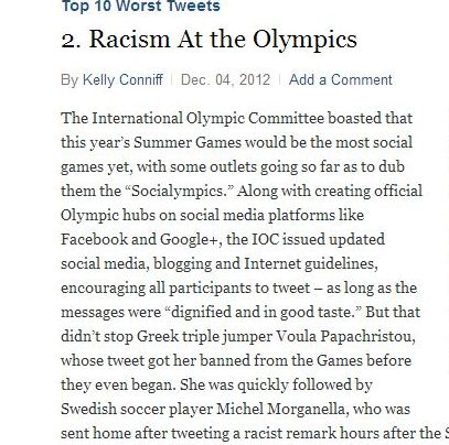 To περιοδικό “Τime” δημοσίευσε τη λίστα με τα 10 χειρότερα tweets του 2012. To “τιτίβισμα” της Βούλας Παπαχρήστου, που στάθηκε αιτία να αποκλειστεί από τους Ολυμπιακούς Αγώνες του 2012, βρίσκεται στη 2η θέση της λίστας.