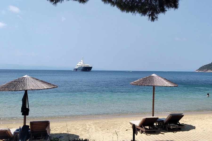Η πολυτελής θαλαμηγός του σεΐχη προερχόμενη από την μαρίνα του Φλοίσβου, αγκυροβόλησε σήμερα το πρωί στον όρμο της ακτής Μάραθα, βραβευμένη επί πολλά χρόνια με την “Γαλάζια Σημαία” και απέναντι από το πολυτελές εμβληματικό ξενοδοχείο “Skiathos Palace”, αποτελώντας θέμα συζητήσεων και θαυμασμού από τον κόσμο, ντόπιους και τουρίστες, που αντικρίζουν την θαλαμηγό.