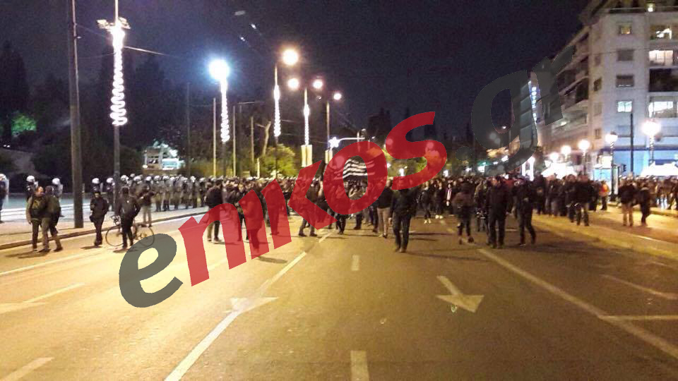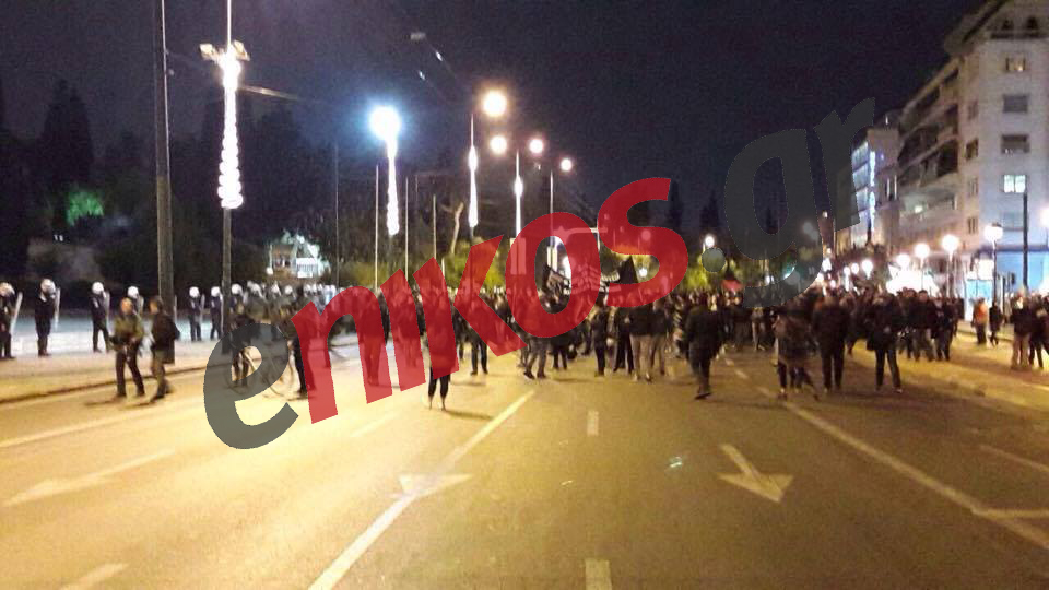 Μέσω της οδού Σταδίου η πορεία στη μνήμη του Αλέξη Γρηγορόπουλου έφθασε μπροστά στη Βουλή με την αστυνομία να την παρακολουθεί διακριτικά.