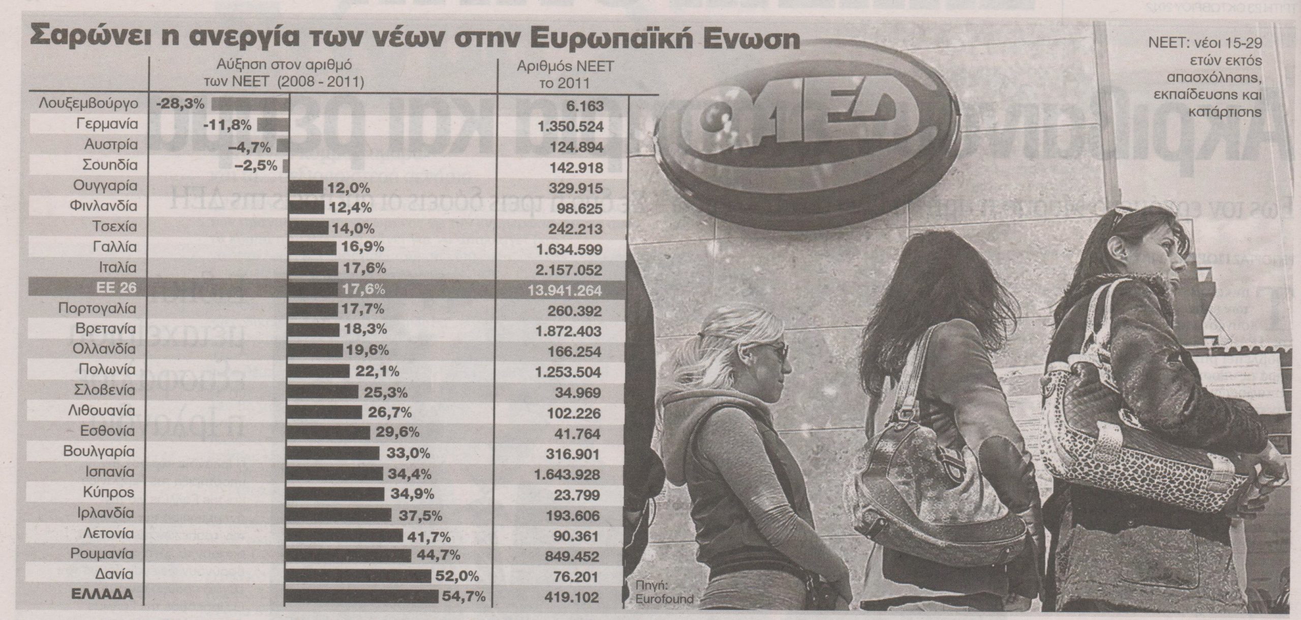 Ο αριθμός των νέων ηλικίας από 15 έως 29 ετών που βρίσκονται “εκτός απασχόλησης, εκπαίδευσης και κατάρτισης” στην Ευρωπαϊκή Ενωση αυξήθηκε δραματικά λόγω της κρίσης από το 2008 έως και το 2011 σε 14 εκατομμύρια, με αποτέλεσμα το κόστος τους σε κοινωνικά επιδόματα και χαμένη παραγωγή να ανέρχεται πλέον στο ιλιγγιώδες ποσό των 153 δισ. ευρώ ετησίως για τις χώρες της Ε.Ε.