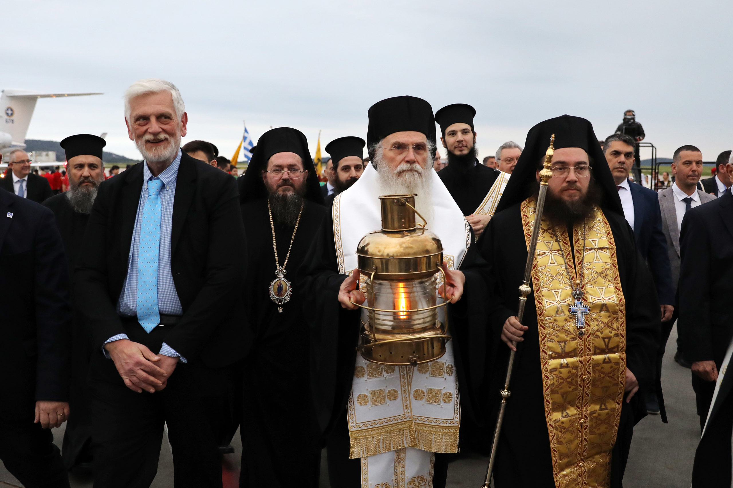 Η υποδοχή του Αγίου Φωτός στην Ελλάδα έγινε με τιμές αρχηγού κράτους, όπως κάθε χρόνο, παρουσία και του προέδρου της Βουλής, Νικήτα Κακλαμάνη.