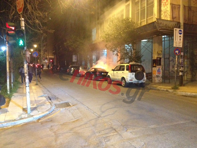 Οι αντιεξουσιαστές που έκαναν πορεία έσπασαν αρχικά τα τζάμια του αυτοκινήτου και στη συνέχεια έβαλαν φωτιά.