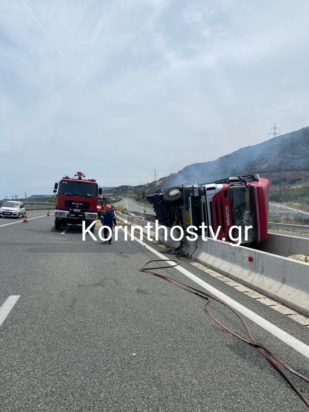 Κάτω από αδιευκρίνιστες συνθήκες, η νταλίκα εξετράπη της πορείας της, ανετράπη και τυλίχτηκε στις φλόγες, σύμφωνα με πληροφορίες του korinthostv.gr.