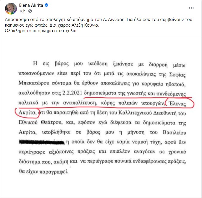 Στο υπόμνημα γίνεται αναφορά και στην Έλενα Ακρίτα η οποία επίσης απάντησε μέσω social media. “Απόσπασμα από το απολογητικό υπόμνημα του Δ. Λιγναδη. Για όλα όσα του συμβαίνουν του καημένου εγώ φταίω. Δια χειρός Αλέξη Κούγια. Ολόκληρο το υπόμνημα στα σχόλια” έγραψε η συγγραφέας και δημοσιογράφος. Έχει μάλιστα δημοσιεύσει σε φωτογραφία το απόσπασμα από την απολογία του σκηνοθέτη και ηθοποιού, που αναφέρεται στην ίδια, “διά χειρός Αλέξη Κούγια”. Στο εν λόγω απόσπασμα αναφέρεται ότι “ακολούθησαν δημοσιεύματα της γνωστής και συνδεόμενης πολιτικά με την αντιπολίτευση, κόρης παλαιών υπουργών, Έλενας Ακρίτα, ότι θα παραιτηθώ από τη θέση του Καλλιτεχνικού Διευθυντή του Εθνικού Θεάτρου και εφόσον εγώ διέψευσα τα δημοσιεύματα της Ακρίτα, υποβλήθηκε σε βάρος μου μήνυση”.