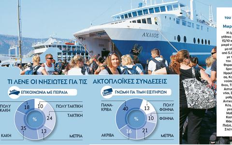 Το 35% θεωρεί κακή τη σύνδεση με το κέντρο, το 18% πολύ κακή και το 13% μέτρια. Αλλο ένα θέμα που «καίει» είναι το κόστος του εισιτηρίου. Το 40% απαντά πως το εισιτήριο είναι «πολύ ακριβό», το 16% το χαρακτηρίζει «ακριβό», ενώ ένα 21% «μέτριο». Το υπόλοιπο 23% προέρχεται κυρίως από νησιά που εξυπηρετούνται με μικρές πορθμειακού τύπου γραμμές.