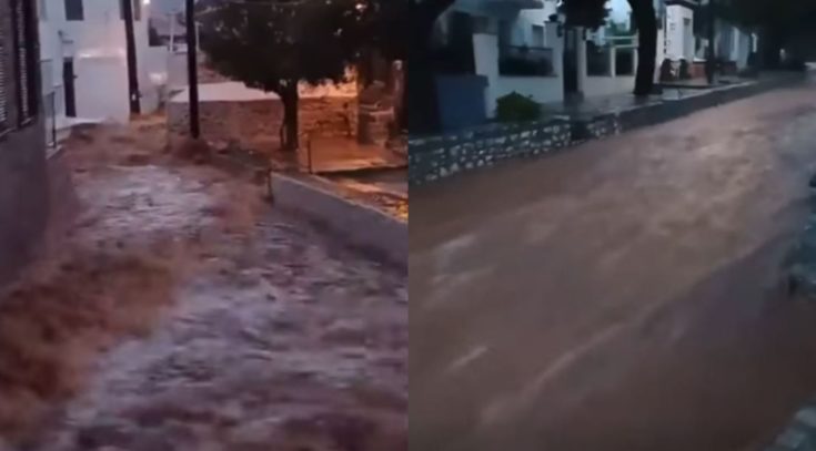 Μάλιστα, βίντεο που κυκλοφορούν στα μέσα κοινωνικής δικτύωσης, καταγράφουν δρόμους του νησιού να έχουν μετατραπεί σε ορμητικούς χειμάρρους, οι οποίοι περνούν ανάμεσα από σπίτια.