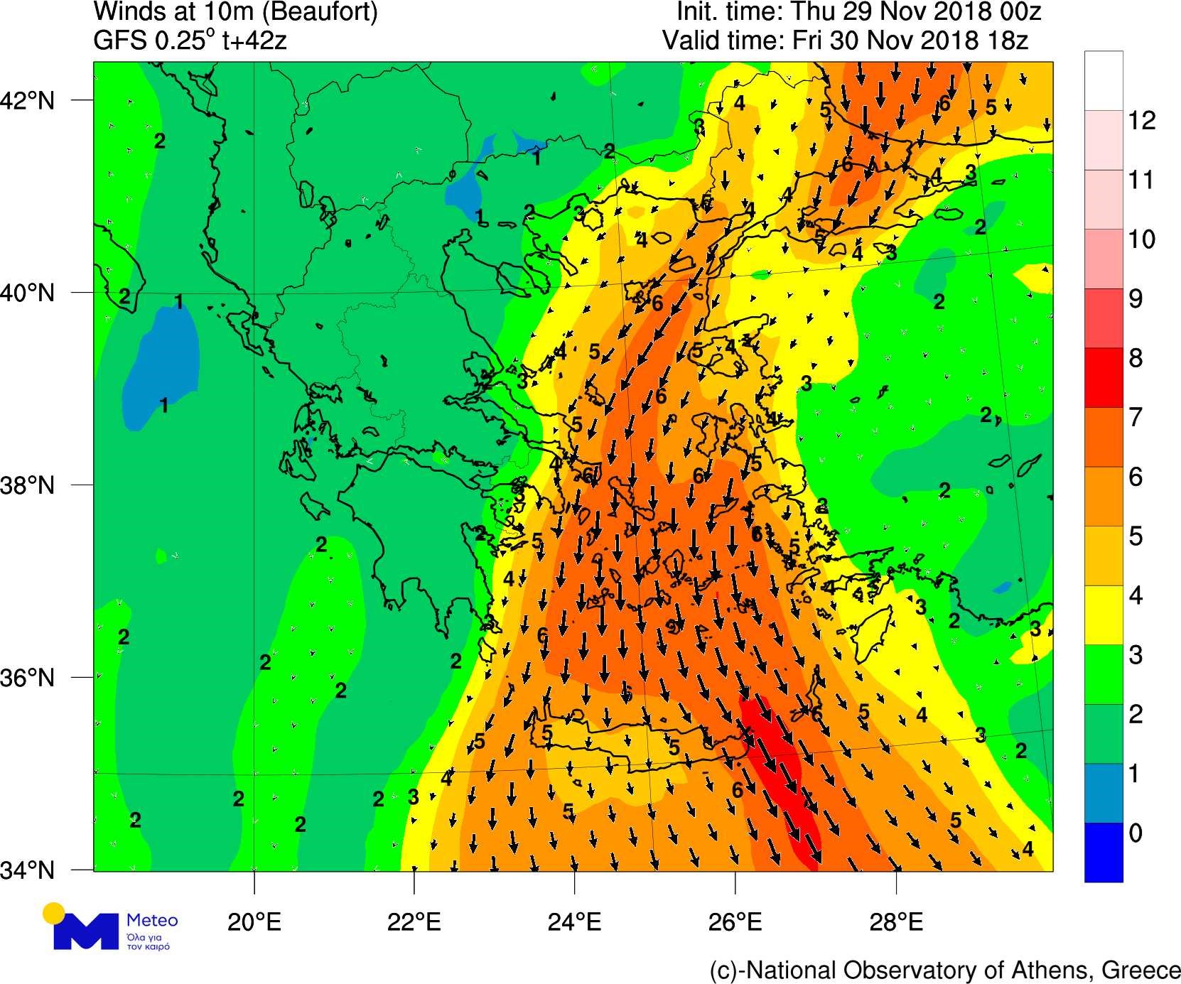 Οι βόρειοι άνεμοι στο Αιγαίο θα πνέουν αρχικά θυελλώδεις 8 μποφόρ, με βαθμιαία εξασθένηση κατά τη διάρκεια της ημέρας, όπου το βράδυ δεν θα ξεπερνούν τα 7 μποφόρ. Η θερμοκρασία σε χαμηλά για την εποχή επίπεδα.