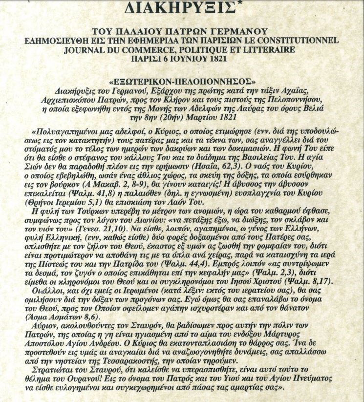 Πρόκειται για τη Διακήρυξη του Παλαιών Πατρών Γερμανού «Εξάρχου της πρώτης κατά την τάξιν Αχαΐας Αρχιεπισκόπου Πατρών, προς τον Κλήρον και τους πιστούς της Πελοποννήσου, η οποία εξεφωνήθη εντός της Μονής των Αδελφών της Λαύρας του όρους Βελία, την 8ην (20ην) Μαρτίου 1821».