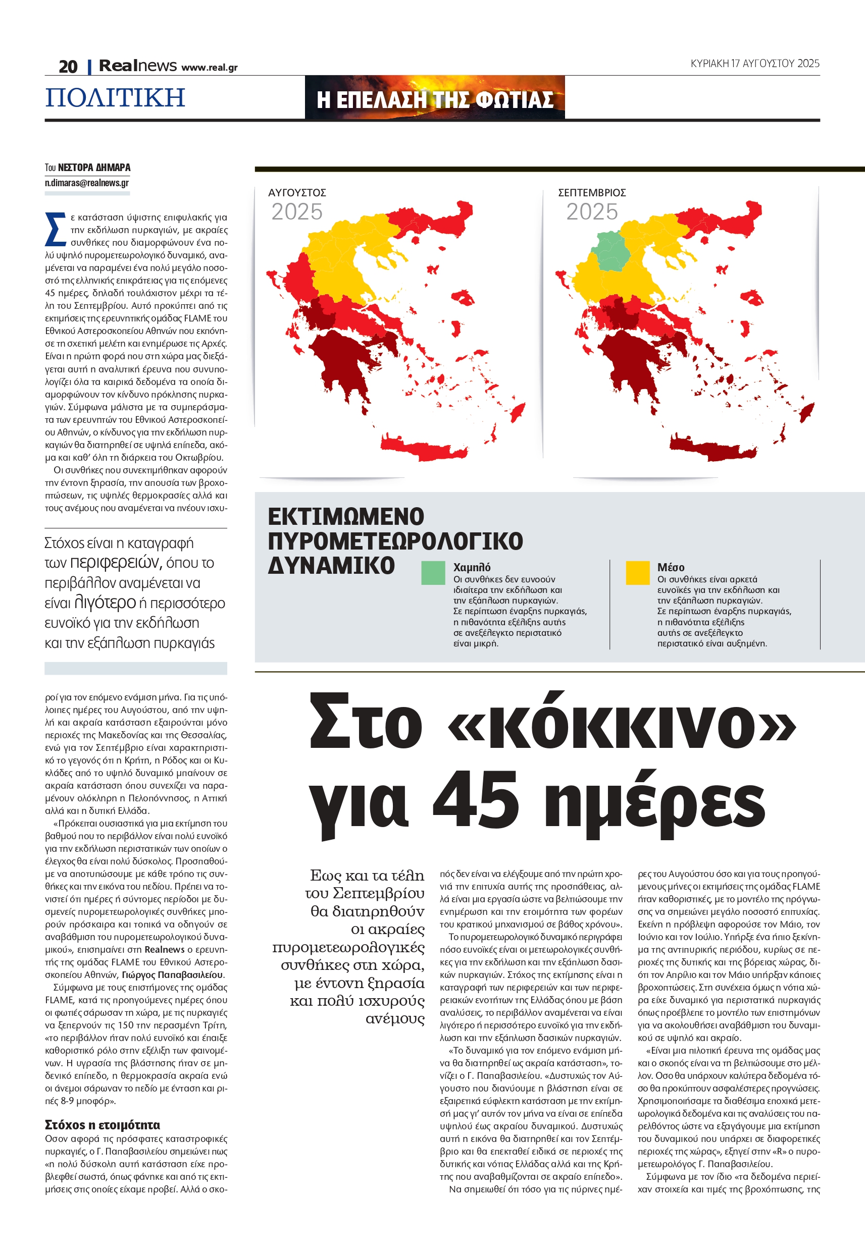Ο Ιούλιος του 2025 χαρακτηρίστηκε στο σύνολο της χώρας από σημαντικά μειωμένες βροχοπτώσεις, πολύ υψηλότερες θερμοκρασίες και συνθήκες έντονης ατμοσφαιρικής ξηρασίας, οι οποίες επιδείνωσαν το πυρομετεωρολογικό δυναμικό του Αυγούστου, δημιουργώντας ένα περιβάλλον πολύ ευνοϊκό για πυρκαγιές. Ετσι, σύμφωνα με την έρευνα της ομάδας FLAME, για τον Αύγουστο αναβαθμίζεται από υψηλό σε ακραίο το πυρομετεωρολογικό δυναμικό σε Αττική, Πελοπόννησο και δυτική Ελλάδα. Ακόμη, αναβαθμίζεται από μέσο σε υψηλό το πυρομετεωρολογικό δυναμικό σε ανατολική Μακεδονία και Θράκη, Ηπειρο, Στερεά Ελλάδα, βόρειο Αιγαίο και Ιόνια Νησιά. Διατηρείται υψηλό το πυρομετεωρολογικό δυναμικό σε νότιο Αιγαίο και Κρήτη. Παράλληλα, από χαμηλό σε μέσο αναβαθμίζεται το πυρομετεωρολογικό δυναμικό σε κεντρική Μακεδονία, δυτική Μακεδονία και Θεσσαλία.