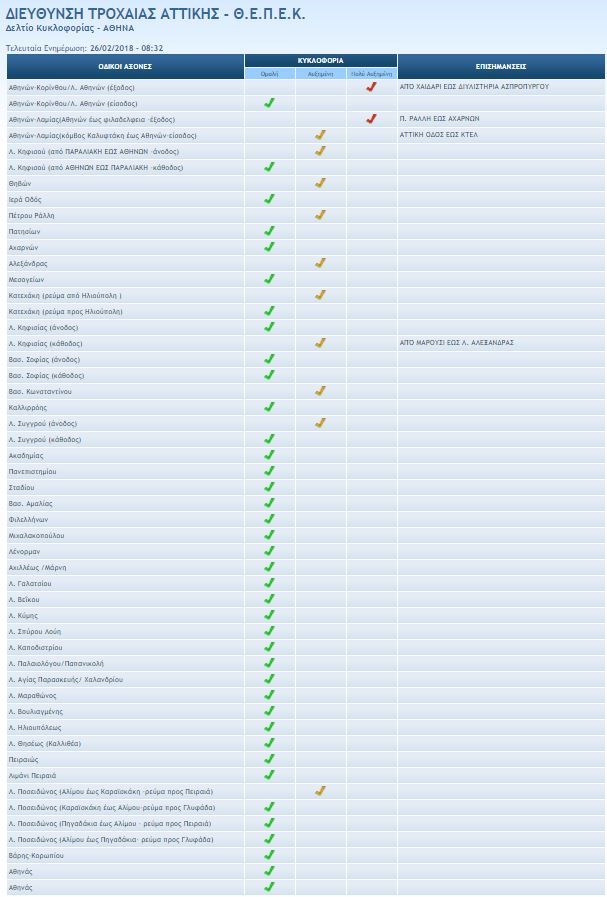 Σύμφωνα με την ενημέρωση από την τροχαία πολύ αυξημένη κίνηση παρατηρείται: στην Αθηνών-Κορίνθου/Λ. Αθηνών (έξοδος) από Χαϊδάρι έως Διυλιστήρια Ασπροπύργου, από Αθηνών-Λαμίας (Αθηνών έως Φιλαδέλφεια – έξοδος) από Πέτρου Ράλλη έως Αχαρνών. Αυξημένη κίνηση παρατηρείται: στην Αθηνών-Λαμίας (κόμβος Καλυφτάκη έως Αθηνών-είσοδος) από την Αττική Οδό έως ΚΤΕΛ, στην Λ. Κηφισού (από Παραλιακή έως Αθηνών – άνοδος), στη Θηβών, στην Πέτρου Ράλλη, στην Αλεξάνδρας, στην Κατεχάκη (ρεύμα από Ηλιούπολη), στη Λ. Κηφισίας (κάθοδος) από Μαρούσι έως Λ. Αλεξάνδρας, στη Βασ. Κωνσταντίνου, στη Λ. Συγγρού (άνοδος) και στη Λ. Ποσειδώνος (Αλίμου έως Καραϊσκάκη -ρεύμα προς Πειραιά).