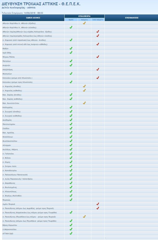 Σύμφωνα με την ενημέρωση από την τροχαία αυξημένη κίνηση παρατηρείται στα εξής σημεία: Αθηνών-Κορίνθου/Λ. Αθηνών (έξοδος), Αθηνών-Λαμίας (Αθηνών έως κόμβος Καλυφτάκη -έξοδος), Αθηνών-Λαμίας(κόμβος Καλυφτάκη έως Αθηνών -είσοδος), Λ. Κηφισού (από Αττική οδό έως Αχαρνών – κάθοδος), Πέτρου Ράλλη, Αλεξάνδρας, Κατεχάκη (ρεύμα από Ηλιούπολη), Λ. Κηφισίας (άνοδος), Λ. Κηφισίας (κάθοδος), Βασ. Κωνσταντίνου, Λιμάνι Πειραιά, Λ. Ποσειδώνος (Αλίμου έως Αμφιθέας – ρεύμα προς Πειραιά), Λ. Ποσειδώνος (Πηγαδάκια έως Αλίμου – ρεύμα προς Πειραιά).