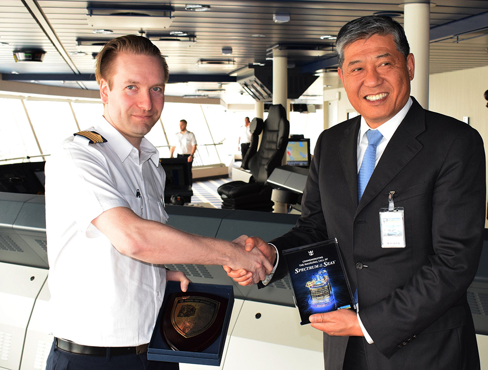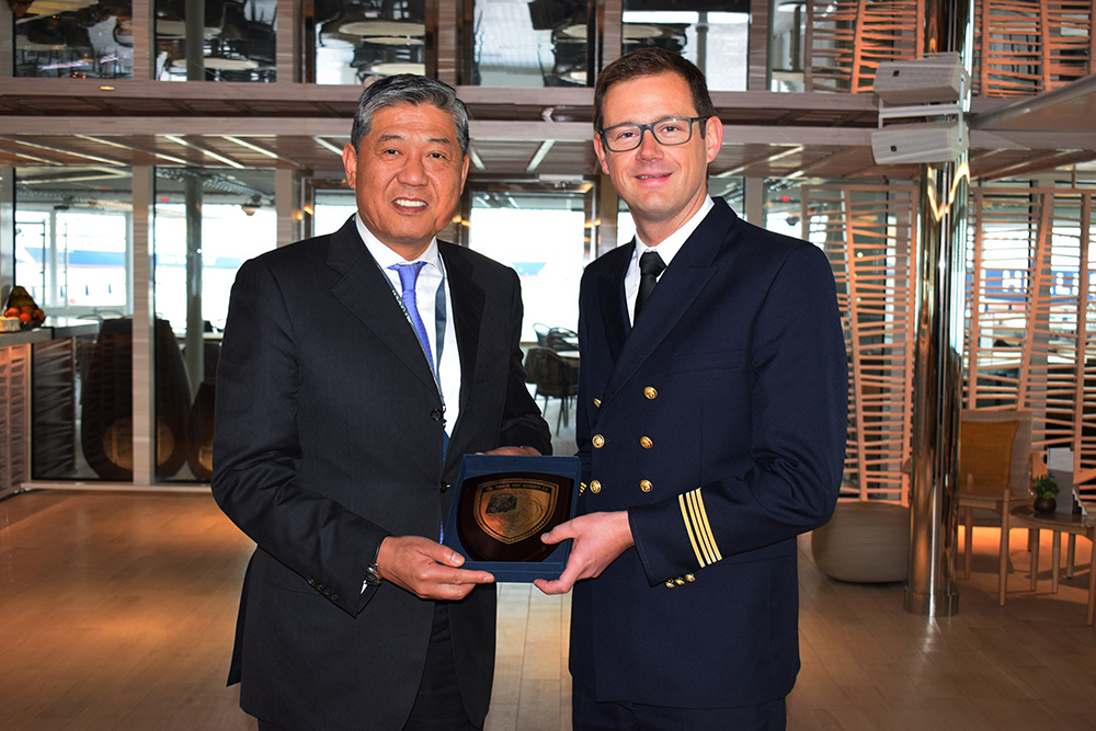 Στο μεταξύ, άλλο ένα νεότευκτο κρουαζιερόπλοιο, το «Bougainville», που ναυπηγήθηκε επίσης τον Απρίλιο του 2019, υποδέχθηκαν εκπρόσωποι της διοίκησης της ΟΛΠ Α.Ε., που παρέδωσαν στον πλοίαρχο, Cpt. Remi Genevaz, τιμητική πλακέτα και βιβλία για τη βιβλιοθήκη του πλοίου.