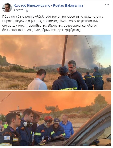 «Πάμε για νύχτα μάχης ολόκληρου του μηχανισμού με τα μέτωπα στην Εύβοια. Μεγάλος ο βαθμός δυσκολίας αλλά δίνουν το μέγιστο των δυνάμεών τους, πυροσβέστες, εθελοντές, αστυνομικοί και όλοι οι άνθρωποι του ΕΚΑΒ, των δήμων και της Περιφέρειας», δήλωσε σε ανάρτησή του στο facebook ο κ. Μπακογιάννης.