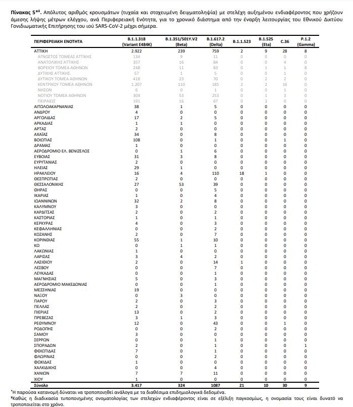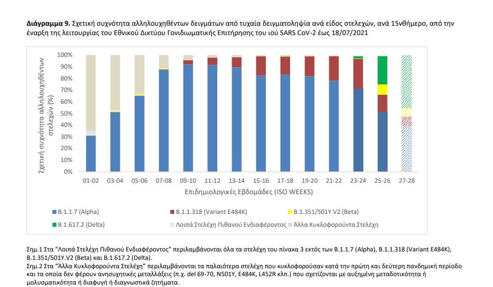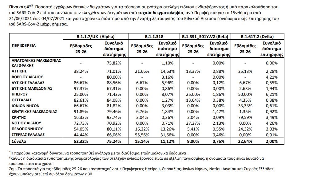 Ολοκληρώθηκε από το Eθνικό Δίκτυο Γονιδιωματικής Επιτήρησης του ιού SARS-CoV-2, που λειτουργεί υπό το συντονισμό του ΕΟΔΥ, η γονιδιωματική ανάλυση σε 359 δείγματα που έχουν επιλεγεί τυχαιοποιημένα ή στοχευμένα και αφορούν στην περίοδο 10 Ιουνίου 2021 έως 12 Ιουλίου 2021 . Από τον έλεγχο των 359 δειγμάτων, αναδείχθηκαν συνολικά 334 δείγματα με στελέχη ειδικού ενδιαφέροντος (Variants Of Concern – VOC) και 21 δείγματα με στελέχη υπό παρακολούθηση (Variants Under Monitoring). Εκ των 334 δειγμάτων με στελέχη ειδικού ενδιαφέροντος, τα 219 αφορούν στο στέλεχος Delta, 97 αφορούν στο Alpha, 16 αφορούν στο Βeta και 2 αφορούν στο Gamma. Εκ των 21 δειγμάτων με στελέχη υπό παρακολούθηση, όλα αφορούν στο στέλεχος B.1.1.318 (Variant E484K) (Πίνακας 3). Από την έναρξη λειτουργίας του Εθνικού Δικτύου Γονιδιωματικής Επιτήρησης του ιού SARS-CoV-2 μέχρι σήμερα έχουν ελεγχθεί στην επικράτεια συνολικά 23.015 δείγματα από εγχώρια κρούσματα. Εξ αυτών 19.517 προέρχονται από τυχαία επιλογή δειγμάτων, 2.633 προέρχονται από στοχευμένη λήψη ή επιλογή δειγμάτων και για 865 δείγματα δεν είναι διαθέσιμος ο τρόπος επιλογής. Μεταξύ των 19.517 τυχαία επιλεγμένων δειγμάτων στην επικράτεια, τα τέσσερα πιο συχνά στελέχη ειδικού ενδιαφέροντος ή υπό παρακολούθηση που έχουν απομονωθεί είναι το Alpha, με ποσοστό 75,24%, ακολουθούμενο από το B.1.1.318 (Variant E484K) με ποσοστό 11,12%, το Delta με ποσοστό 2,00% και το Beta με ποσοστό 0,76% (Πίνακας 4). Η διαχρονική εξέλιξη της σχετικής συχνότητας των αλληλουχηθέντων δειγμάτων από τυχαία δειγματοληψία ανά είδος στελεχών, μέχρι και την εβδομάδα 26 απεικονίζεται στο Διάγραμμα 9, ενώ δίνονται επιπλέον προσωρινά στοιχεία για τις εβδομάδες 27-28. Από τα 2.633 δείγματα που έχουν ληφθεί ή επιλεγεί στοχευμένα, έχουν βρεθεί 2.471 στελέχη ειδικού ενδιαφέροντος ή υπό παρακολούθηση. Από τα δείγματα αυτά, 49,11% αφορούν στο B.1.1.318 (Variant E484K), 21,23% στο Delta, 16,41% στο Alpha, 6,84% στο Beta, 0,15% στο C.36 και 0,11% στο Gamma. Επιπλέον, έχουν απομονωθεί συνολικά 171 στελέχη ειδικού ενδιαφέροντος ή υπό παρακολούθηση ή ενδιαφέροντος από δείγματα εισαγόμενων κρουσμάτων, εκ των οποίων 109 αφορούν στο Alpha, 47 στο Delta, 5 στο Beta, 4 στο Β.1.1.318 (Variant E484K), 2 στο B.1.621 (VOI), 1 στο Eta, 1 στο Kappa, 1 στο C.36, 1 στο B.1.623. Όσον αφορά στα στελέχη ενδιαφέροντος που χρήζουν άμεσης λήψης μέτρων ελέγχου επί του παρόντος στη χώρα, η γεωγραφική κατανομή ανά Περιφερειακή Ενότητα παρουσιάζεται στον πίνακα 5